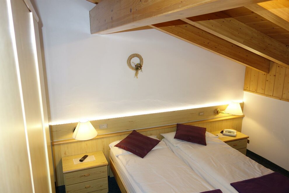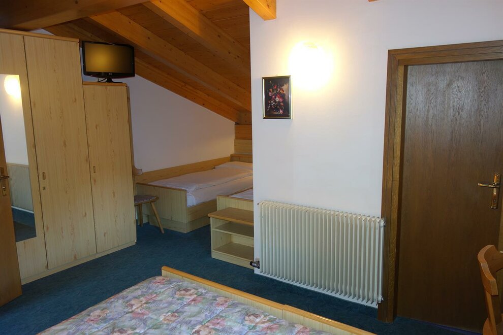 Pokój dwuosobowy/małżeński z dwoma łóżkami pojedynczymi o powierzchni około 25 m², usytuowany na wschód. Bardzo przytulny pokój na poddaszu z drewnianym stropem, nieco niskim w niektórych miejscach (od 3 m do około 1,50 m), bez balkonu z oknem na dolinę, z wykładziną dywanową, wyposażony w Wi-Fi, telewizor płaskoekranowy, sejf, telefon, mini zestaw do szycia. Łazienka z umywalką, WC, bidetem, prysznicem z kabiną, suszarką do włosów, zestawem kosmetyków, ręcznikami. Zdjęcia zostały zrobione zwykłym aparatem fotograficznym, bez obiektywu szerokokątnego, aby uniknąć złudnych obrazów.
