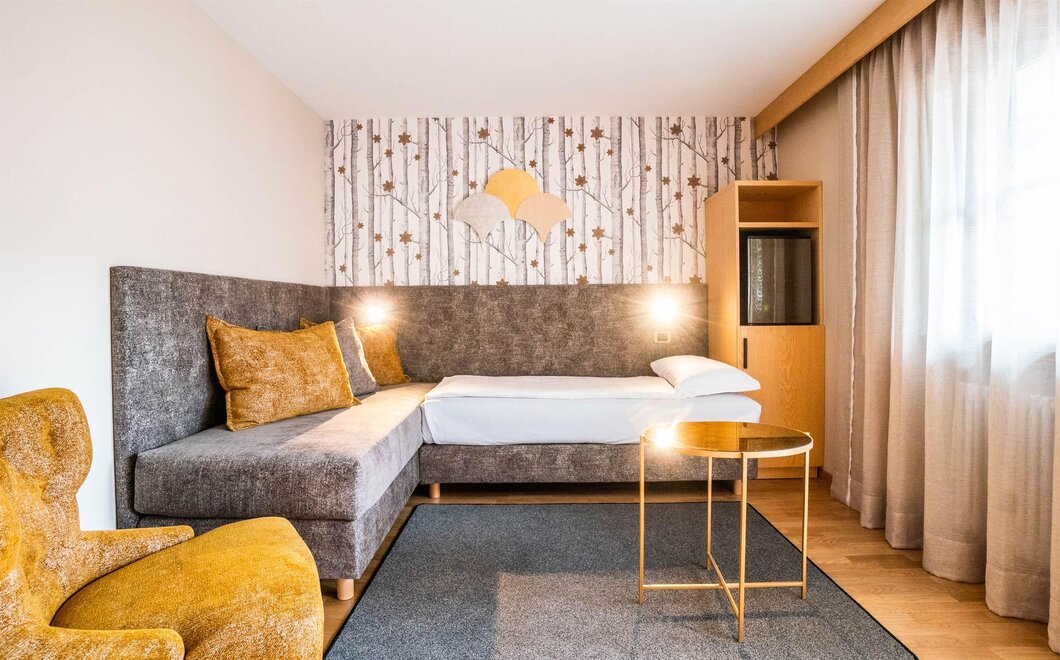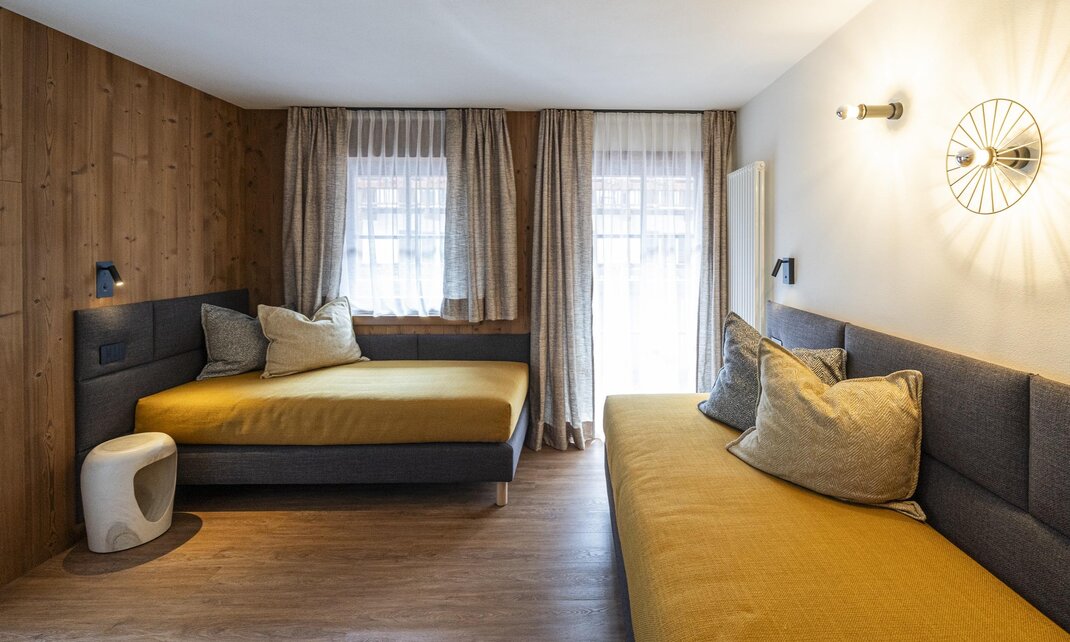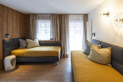 Odnowiona suite superior dla 4 osób z sypialnią, częścią dzienną z pojedynczymi sofami i łazienką z prysznicem.