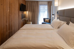 Nowo odnowiona Suite Superior ma sypialnią z łóżkiem małżeńskim (lub dwoma pojedynczymi łóżkami), częścią dzienną z pojedynczym łóżkiem, łazienką z prysznicem i balkonem - bez wykładziny dywanowej.