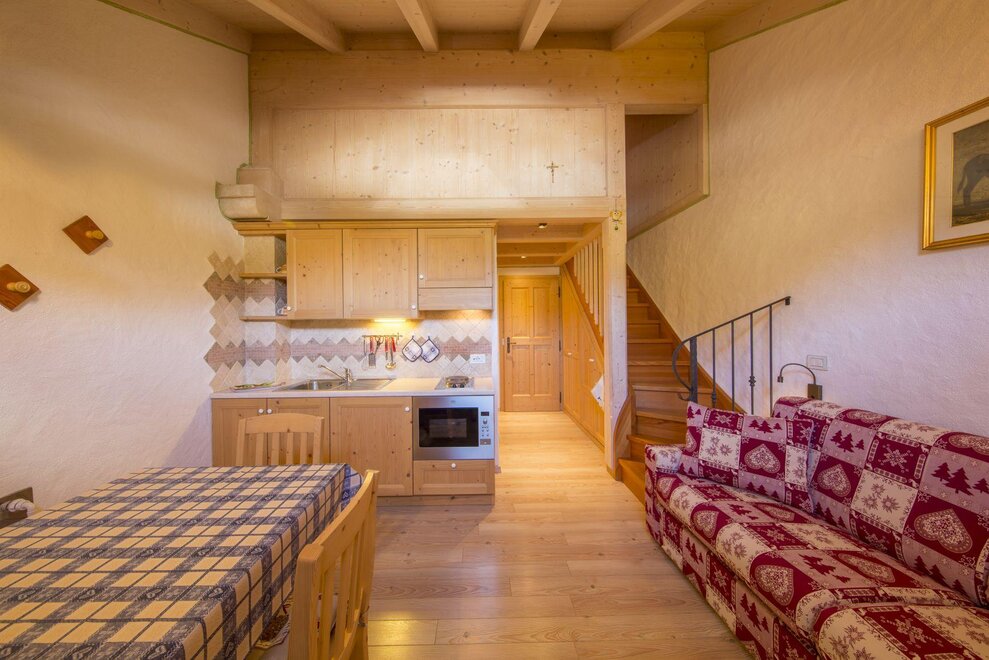 Dwa apartamenty (maks. dla 2 osób) o powierzchni 27 metrów kwadratowych, rozwijają się na dwóch poziomach.W cenę wliczone: szybkie Wi-Fi, ciepła woda, podatek ekologiczny, zniżki w restauracjach/pizzeriach, karta Val di Fassa + Trentino Guest Card, zniżki na wypożyczalnię rowerów. Darmowy skibus na stoki narciarskie w okolicy!