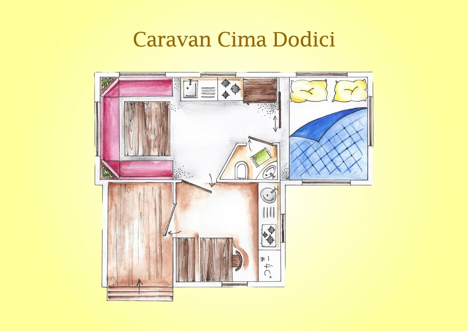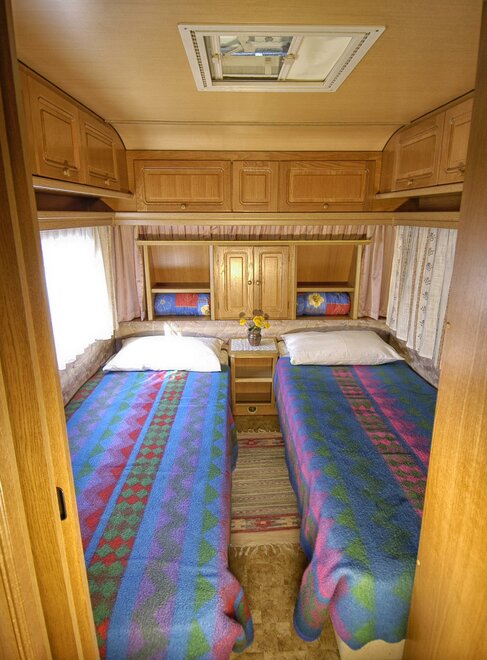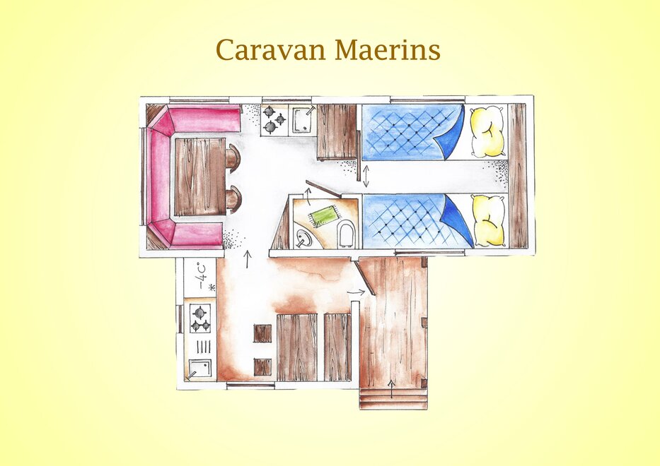 Kemping oferuje noclegi w przyczepach kempingowych dla 2 do 4 osób, odpowiednich na wszystkie sezony z lub bez toalety. Przyczepy są wyposażone w garnki, naczynia, lodówkę, kuchenkę gazową, zlew, poduszki, koce. Każda jednostka mieszkalna posiada drewniane i tyrolskie przedsionek. Ten typ zakwaterowania oferuje zaletę powiększenia dostępnej przestrzeni. Latem na zewnątrz dostępne są: parasol, leżaki i krzesła z stołem. Prysznice w tych rozwiązaniach mieszkalnych znajdują się w ogólnodostępnych toaletach kempingu.