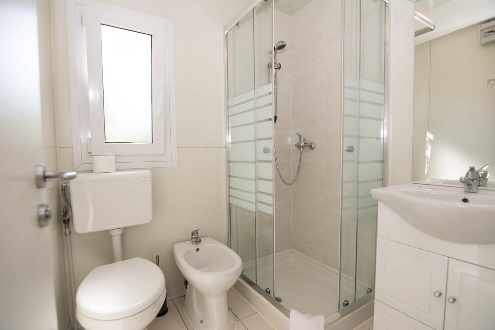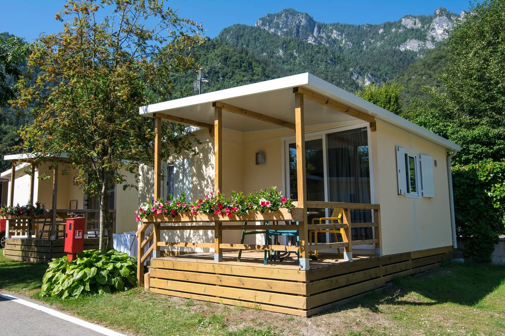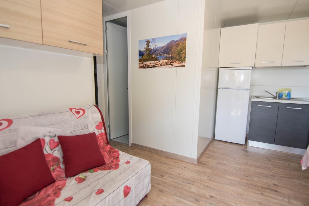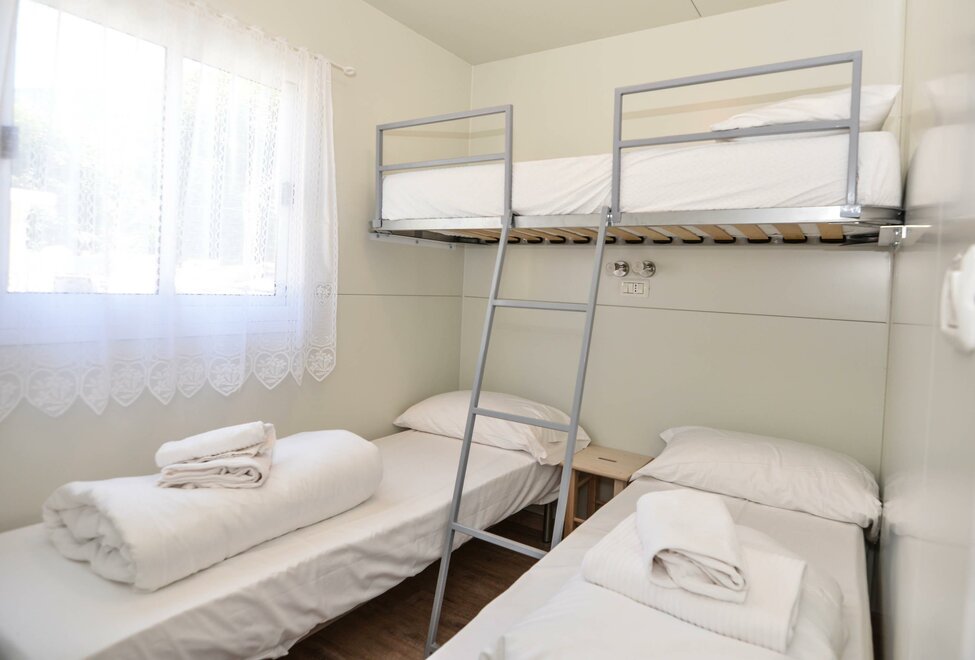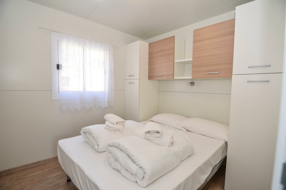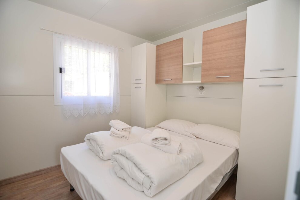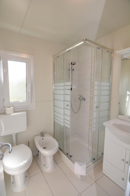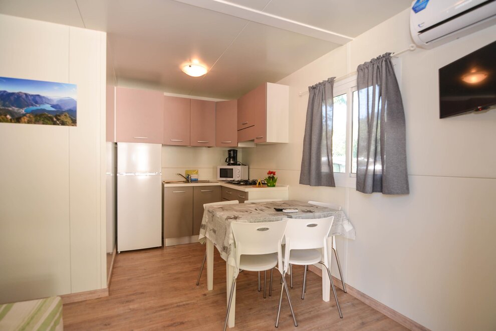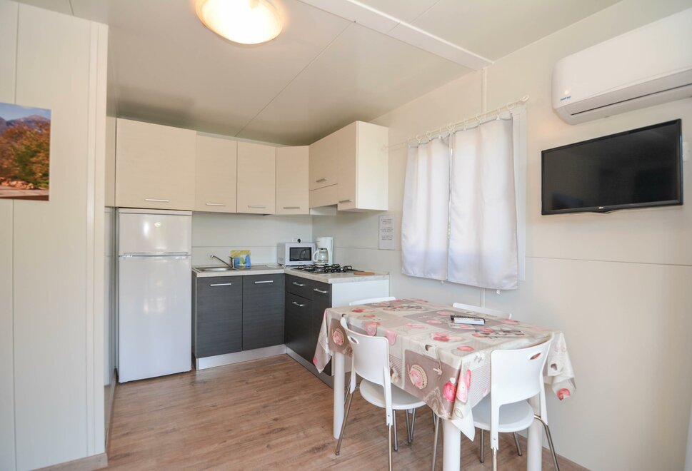 10 Nowe Mobilhomy, gustownie urządzone i wyposażone we wszystkie udogodnienia. Salon z aneksem kuchennym, rozkładana dwuosobowa sofa, lodówka z zamrażarką, niemiecka ekspres do kawy, mikrofalówka, klimatyzacja/ogrzewanie, telewizja satelitarna, dwie odrębne sypialnie, jedna z podwójnym łóżkiem, a druga z dwoma lub trzema łóżkami pojedynczymi, łazienka z prysznicem. Zewnętrzny taras z stolikiem i krzesłami. Parking