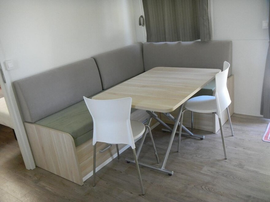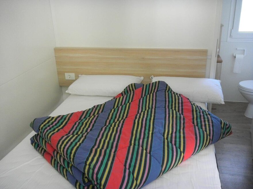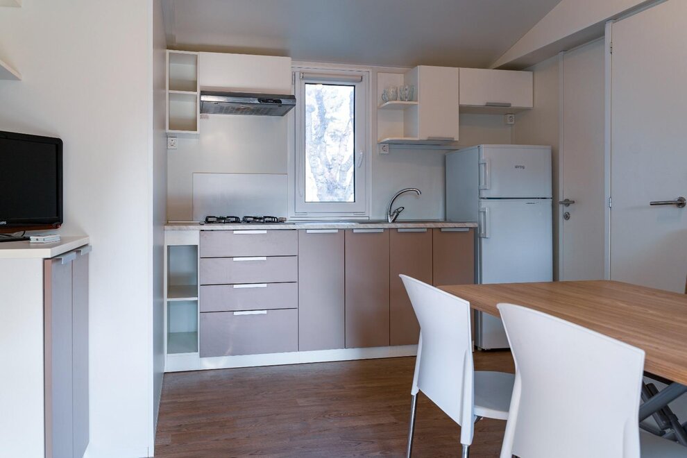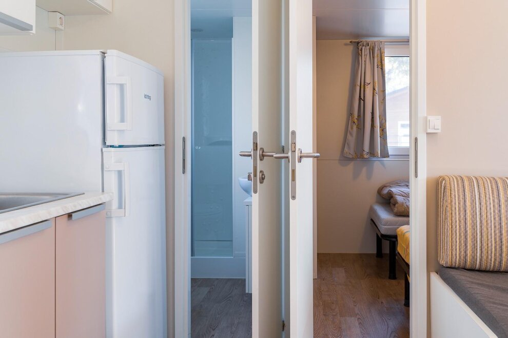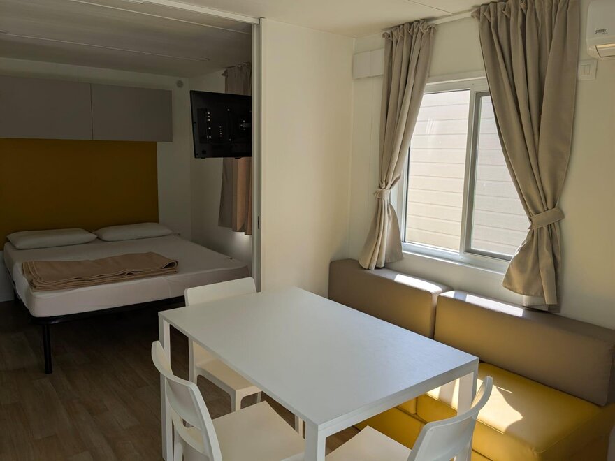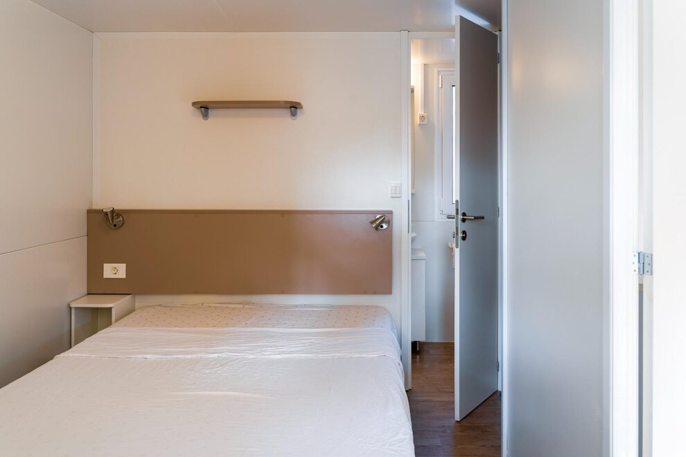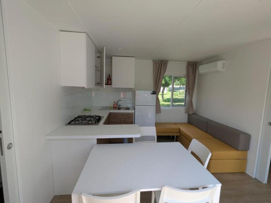 Wygodne, klimatyzowane domki mobilne z zewnętrznym tarasem i stołem do jedzenia na świeżym powietrzu, składają się z 2 sypialni, jednej z podwójnym łóżkiem i jednej z 2 pojedynczymi łóżkami, 1 rozkładaną sofą, 2 łazienkami z prysznicem, miejsca parkingowego na terenie kempingu, w pełni wyposażonej kuchni, lodówki i kuchenki gazowej, elektryczności i ciepłej wody, koców, systemu klimatyzacji, ogrzewania, telewizora LCD.