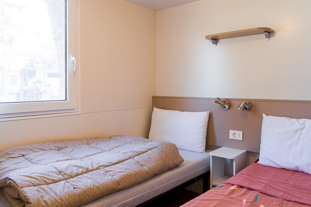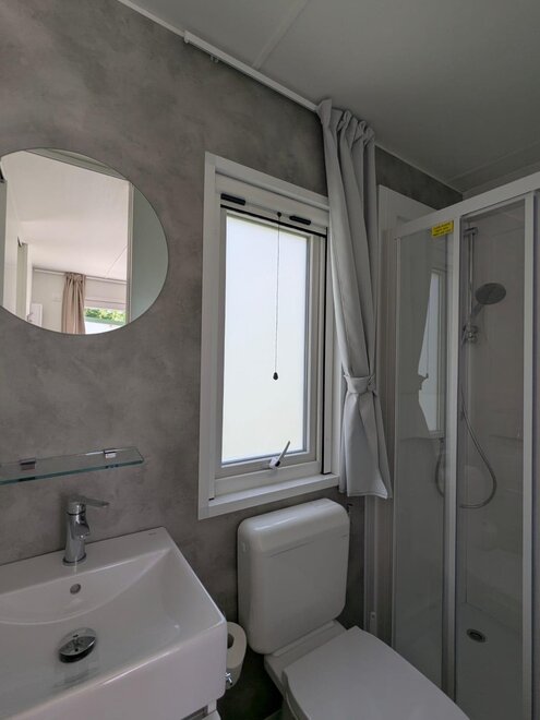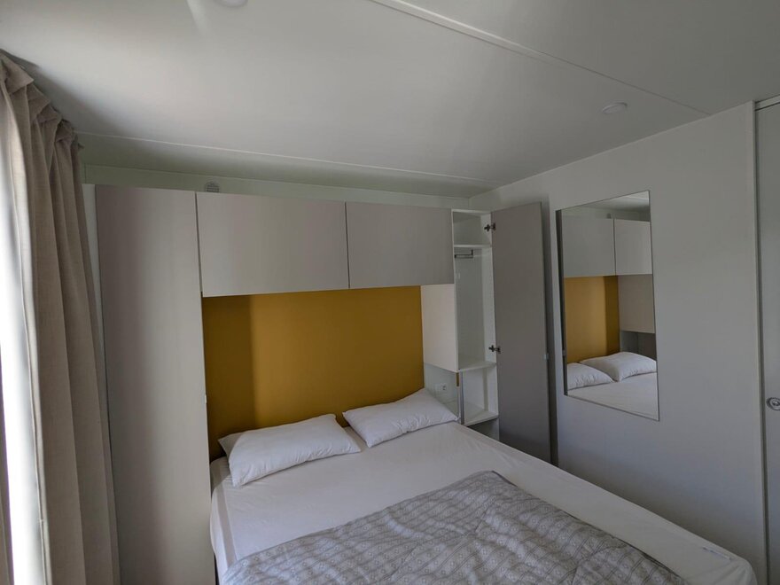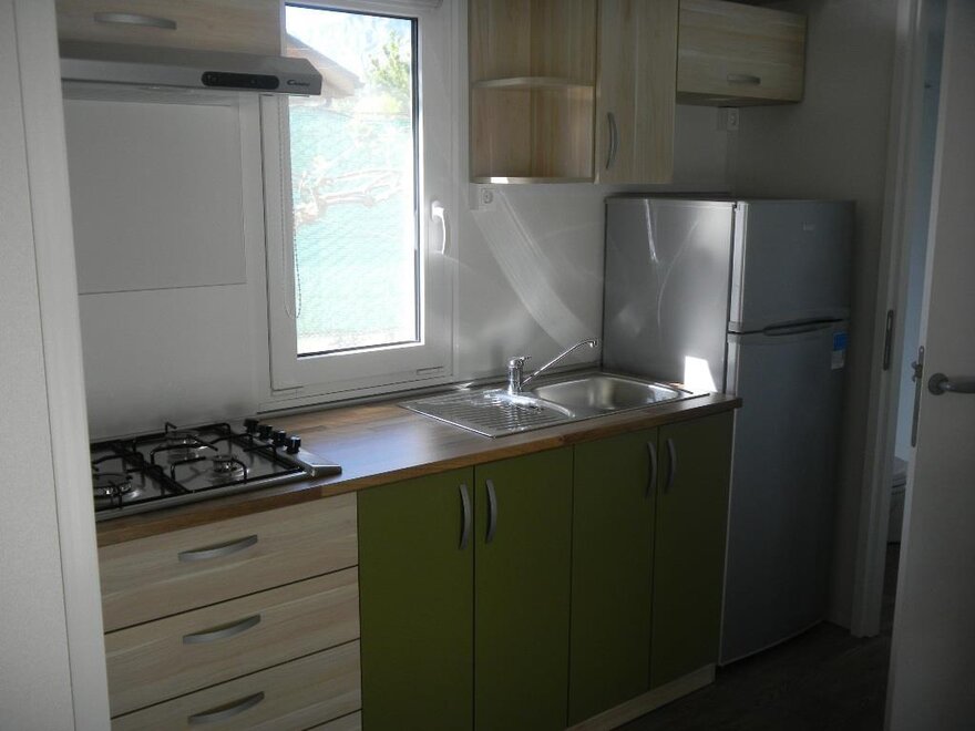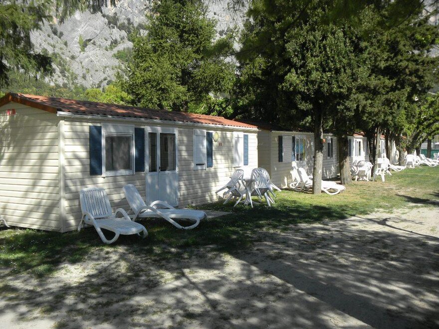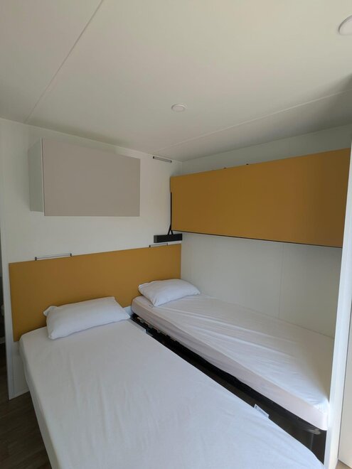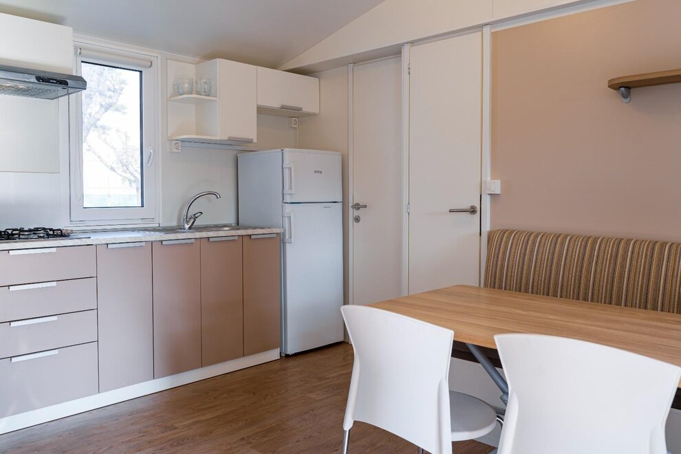Wygodne, klimatyzowane domki mobilne z zewnętrznym tarasem i stołem do jedzenia na świeżym powietrzu, składają się z 2 sypialni, jednej z podwójnym łóżkiem i jednej z 2 pojedynczymi łóżkami, 1 rozkładaną sofą, 2 łazienkami z prysznicem, miejsca parkingowego na terenie kempingu, w pełni wyposażonej kuchni, lodówki i kuchenki gazowej, elektryczności i ciepłej wody, koców, systemu klimatyzacji, ogrzewania, telewizora LCD.