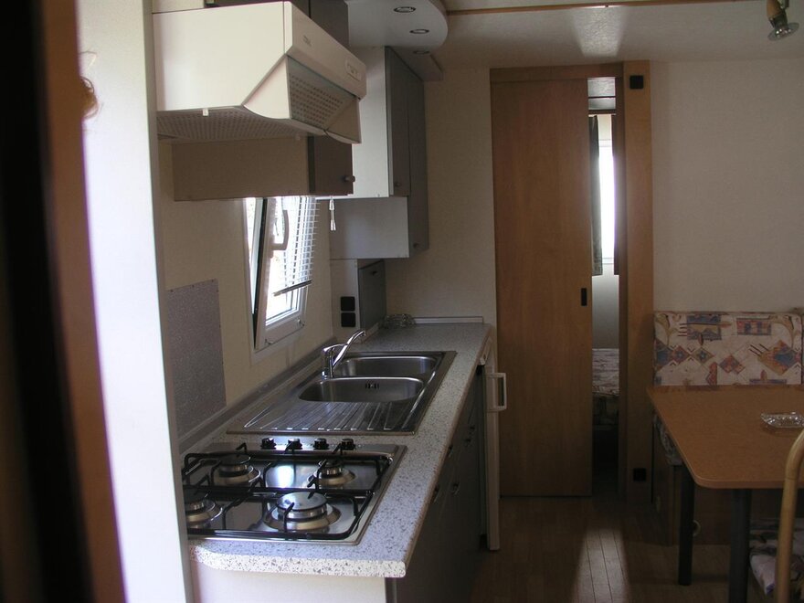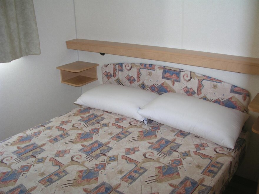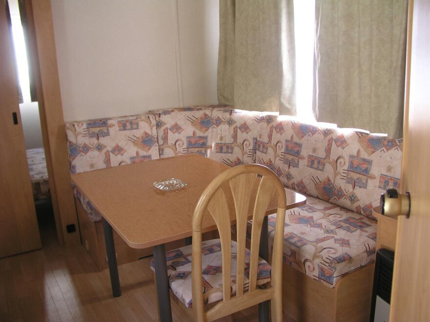 Wygodne, klimatyzowane przyczepy mobilne z zewnętrznym tarasem i stołem do jedzenia na świeżym powietrzu, posiadają 2 sypialnie, jedną małżeńską i jedną z 2 pojedynczymi łóżkami, parking w campingu, kuchnię w pełni wyposażoną, lodówkę i kuchenkę gazową, 1 łazienkę z prysznicem, prąd oraz ciepłą wodę, koce, system klimatyzacji, ogrzewanie, telewizor LCD.