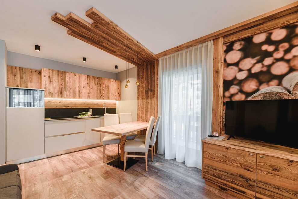 Idealne dla rodzin z dziećmi poniżej 12 roku życia, apartament o powierzchni 40 m² znajduje się na pierwszym piętrze, wyposażony w windę, urządzony jest w rustykalnym drewnianym stylu góralskim i składa się z 1 sypialni z podwójnym łóżkiem lub łóżkami pojedynczymi, salonu z aneksem kuchennym i rozkładaną sofą, 1 łazienki z prysznicem, balkonem z widokiem. Sejf i Wi-Fi na światłowodzie.