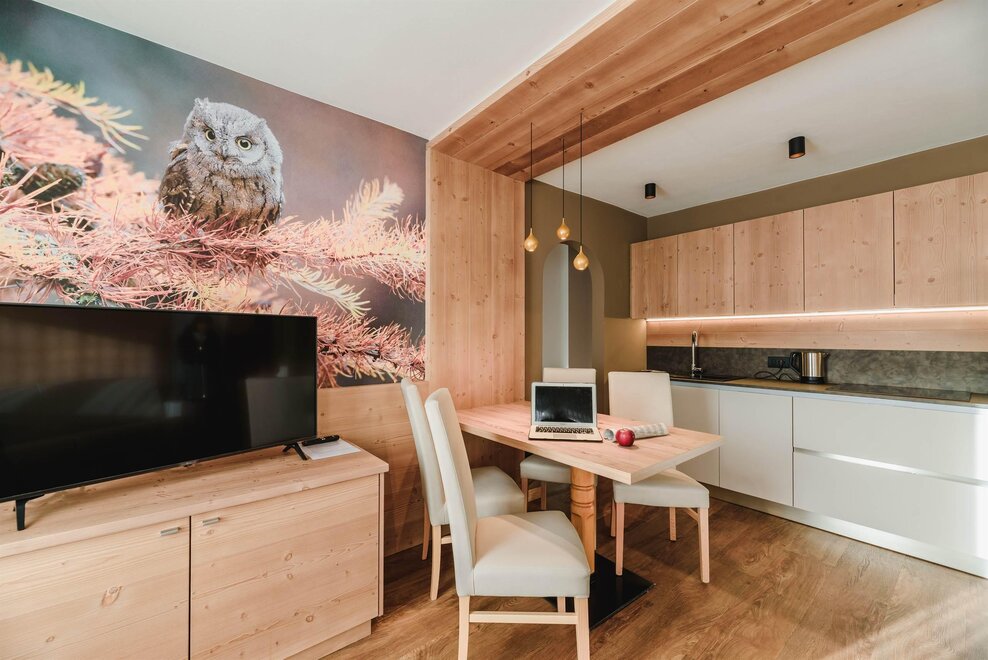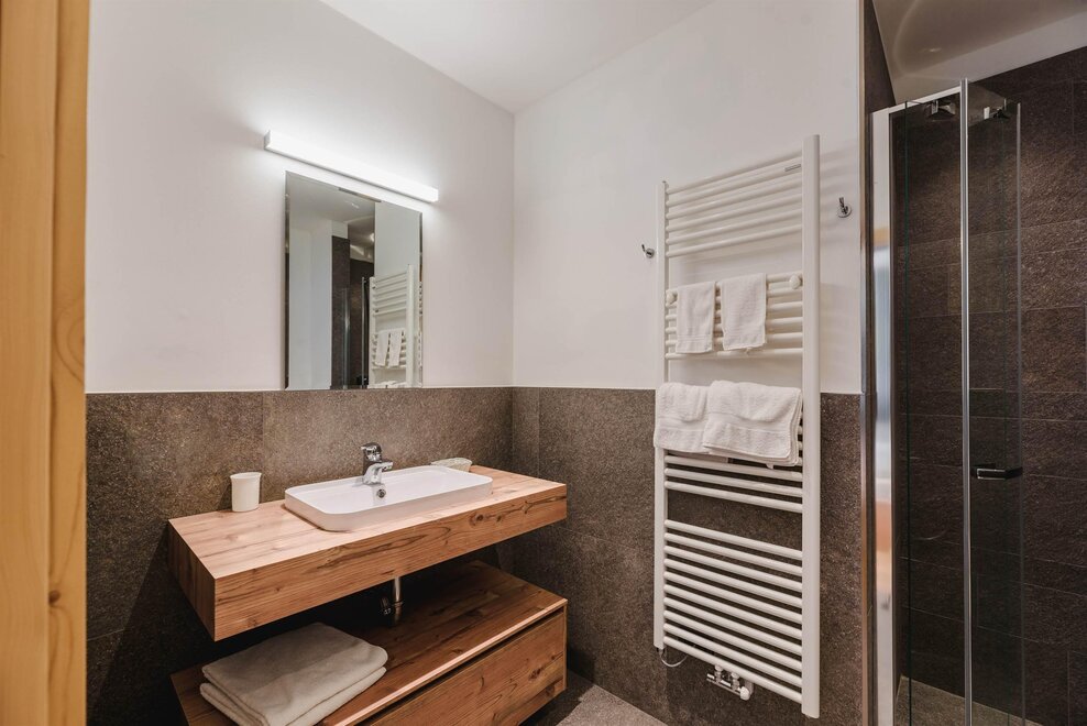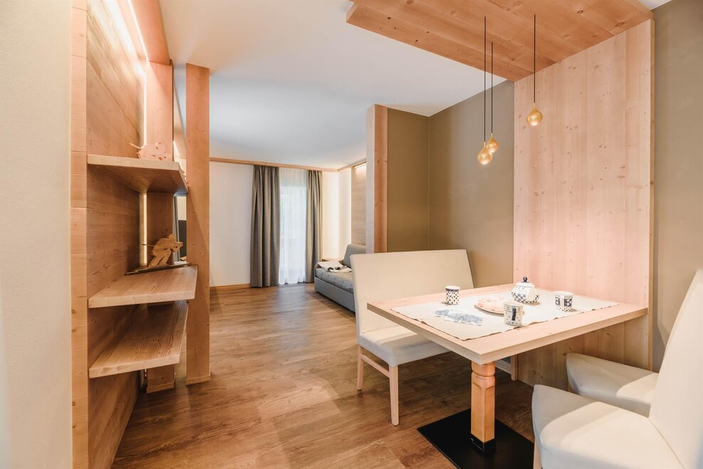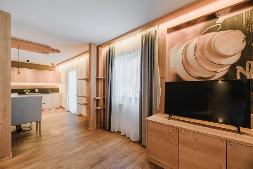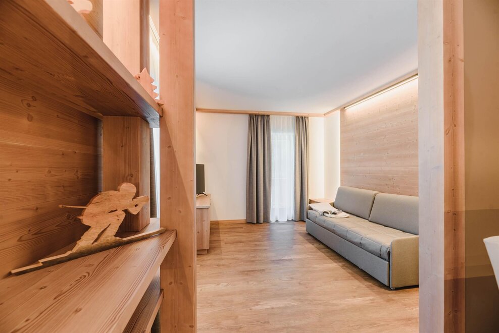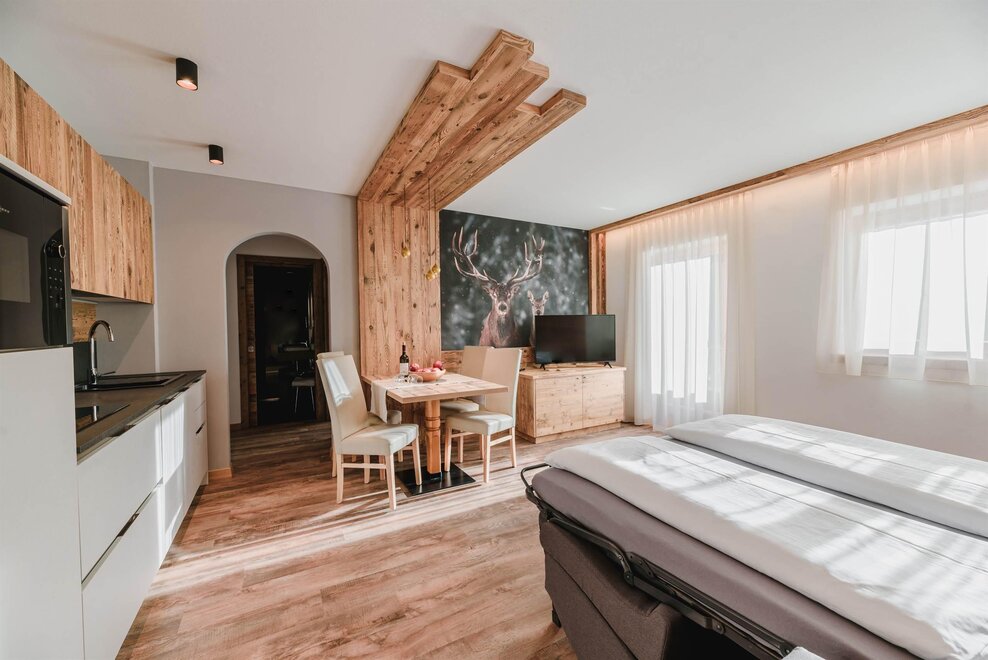 Idealne dla rodzin z dziećmi poniżej 12 roku życia, apartament o powierzchni 40 m², usytuowany na pierwszym piętrze z windą, jest urządzony w rustykalnym drewnie górskim i składa się z 1 sypialni z podwójnym łóżkiem lub łóżkami pojedynczymi, salonu z aneksem kuchennym i rozkładaną kanapą, 1 łazienki z prysznicem oraz balkonu z panoramicznym widokiem. Sejf i Wi-Fi na włóknie.