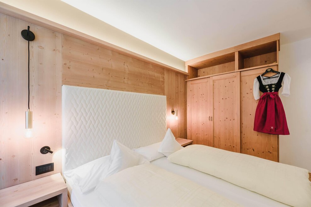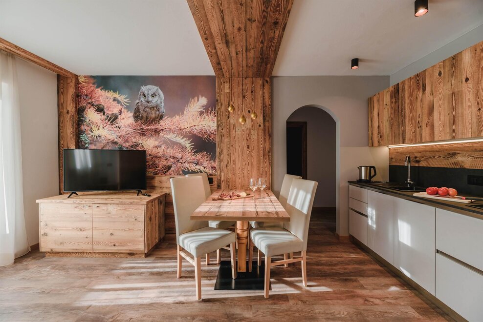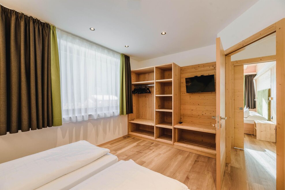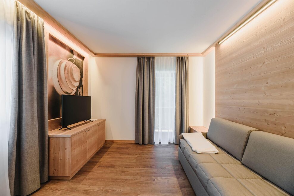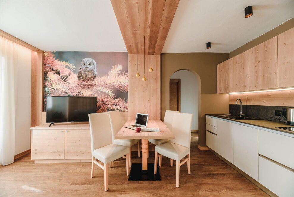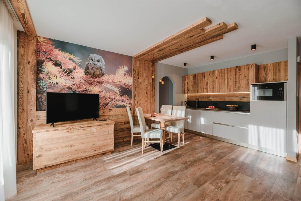 Idealne dla rodzin z dziećmi poniżej 12 roku życia, apartament o powierzchni 40 m², usytuowany na pierwszym piętrze z windą, jest urządzony w rustykalnym drewnie górskim i składa się z 1 sypialni z podwójnym łóżkiem lub łóżkami pojedynczymi, salonu z aneksem kuchennym i rozkładaną kanapą, 1 łazienki z prysznicem oraz balkonu z panoramicznym widokiem. Sejf i Wi-Fi na włóknie.