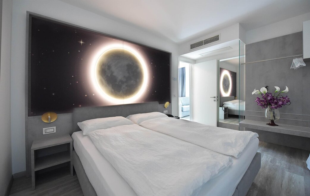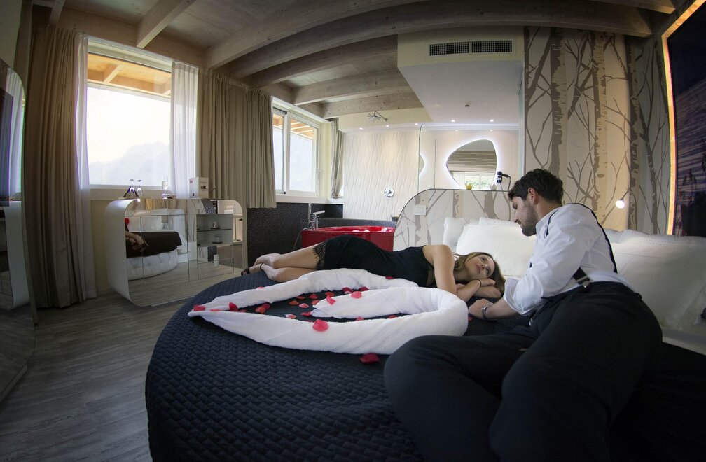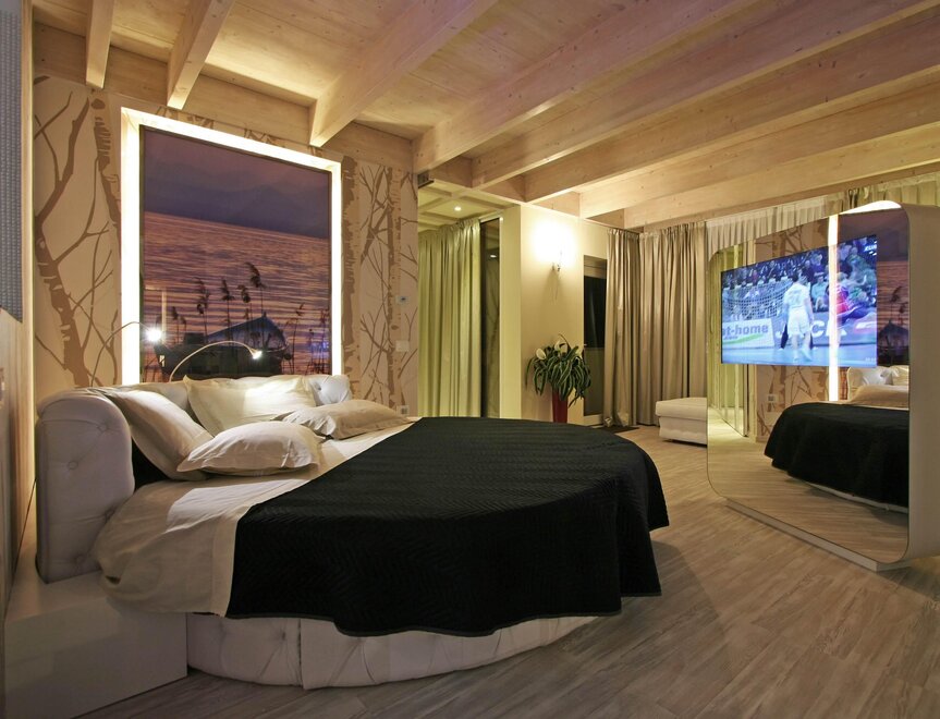 Suite „I Love You” ma nowoczesny design, aby sprawić, że poczujecie się jak w raju, zaprojektowana, aby zapewnić Wam komfort już od pierwszej minuty, wyposażona w czerwone serce wannę z hydromasażem z chromoterapią i aromaterapią.Łóżko to okrągłe maxi king size z dużym obrotowym telewizorem z wszystkimi ulubionymi programami. Ponadto jest również wyposażona w lodówkę i ekspres do kawy.