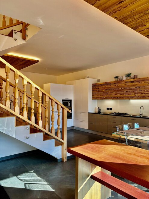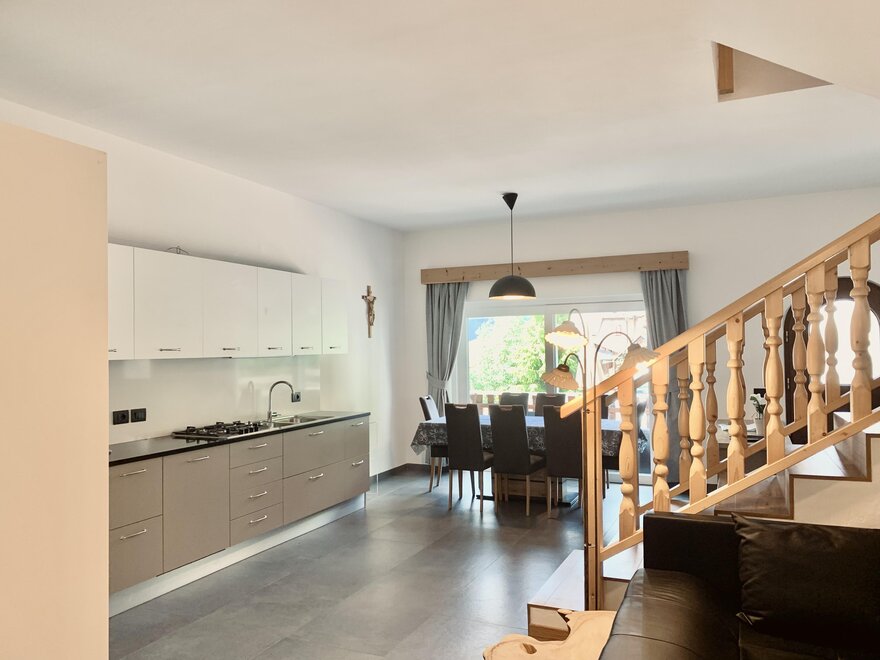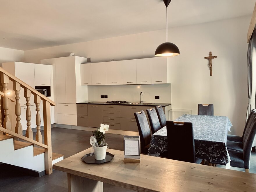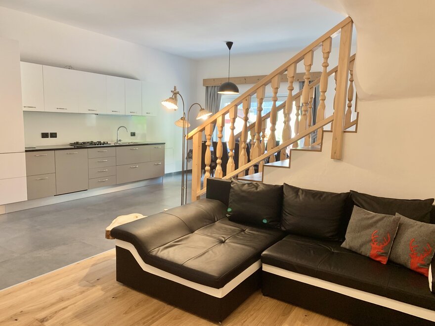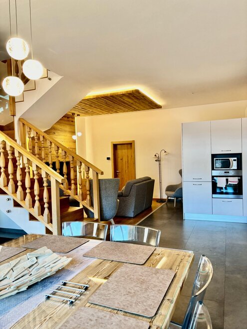 Apartament jest rozłożony na dwóch piętrach i ma przestronną otwartą strefę dzienną z kuchnią, która wychodzi na patio