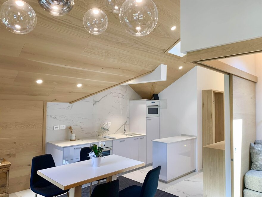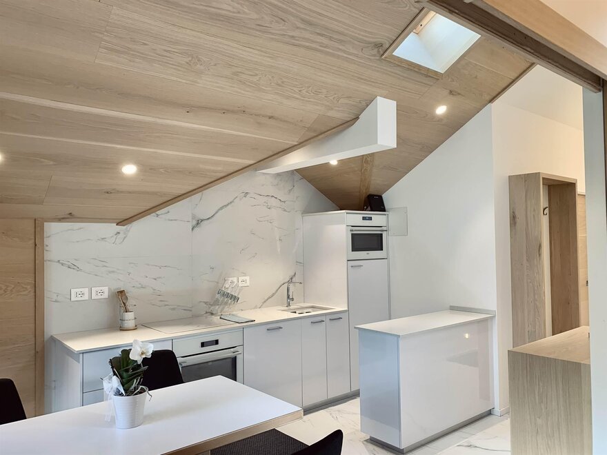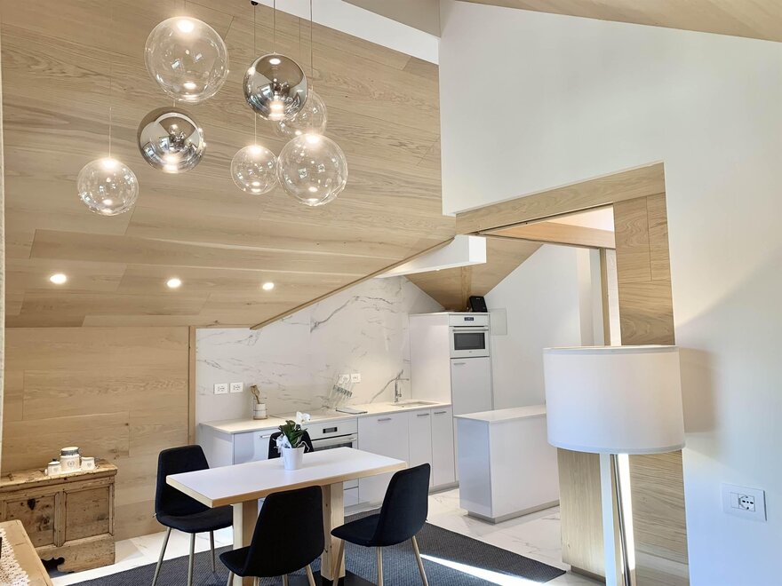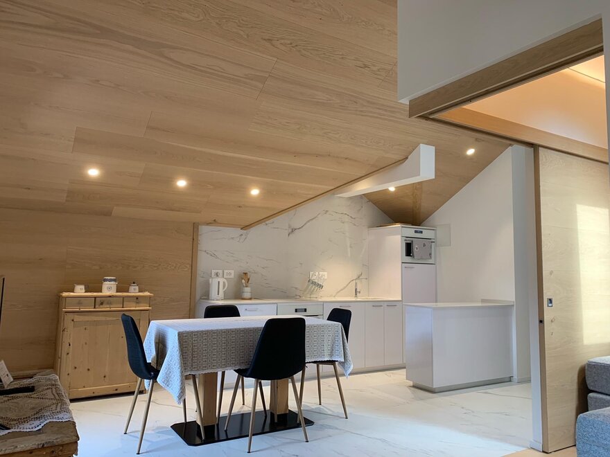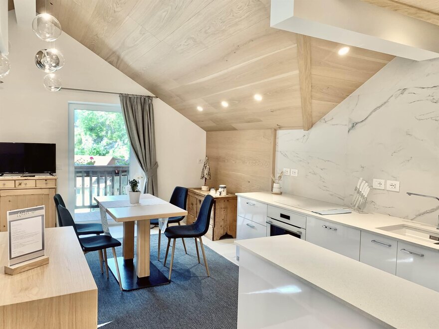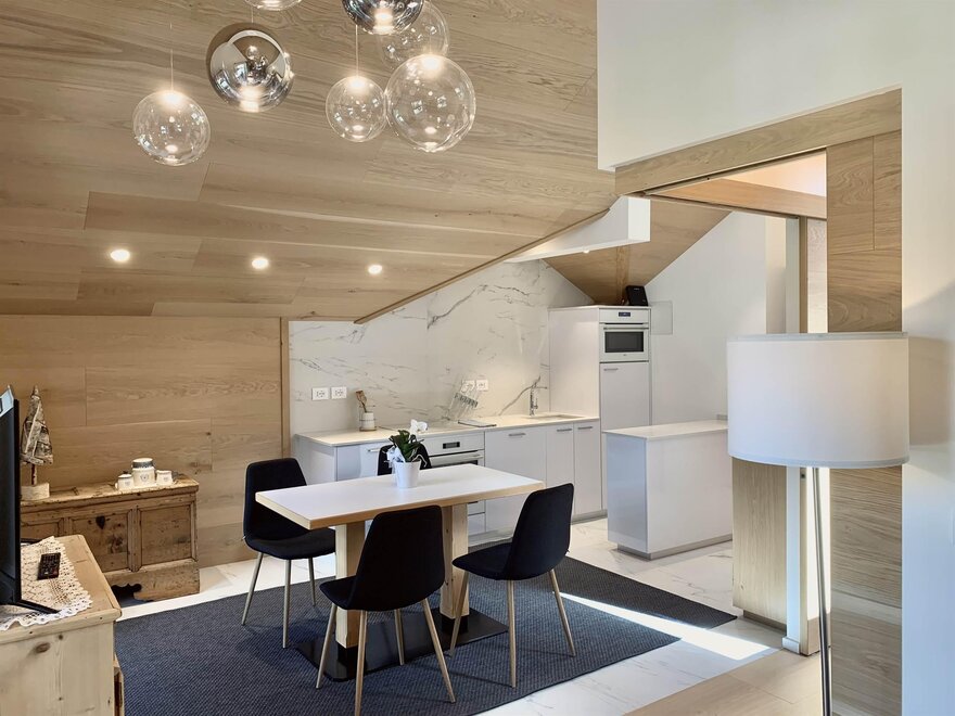 Mansarda składająca się z sypialni z podwójnym łóżkiem, pokoi dwuosobowego, otwartej przestrzeni z jadalnią, aneksem kuchennym i salonem, łazienki, TVSat, pralki, zmywarki, balkonu, prywatnego parkingu, dostępu do internetu