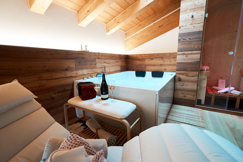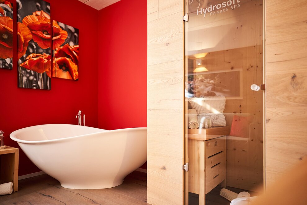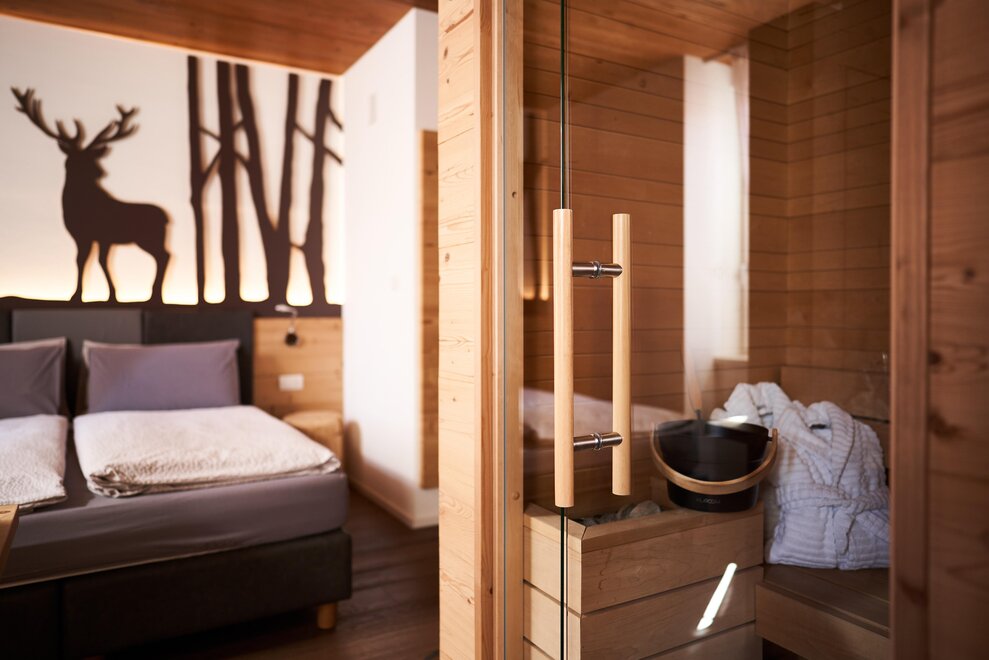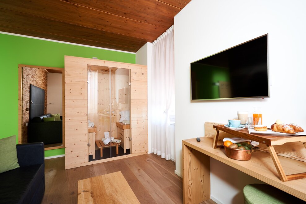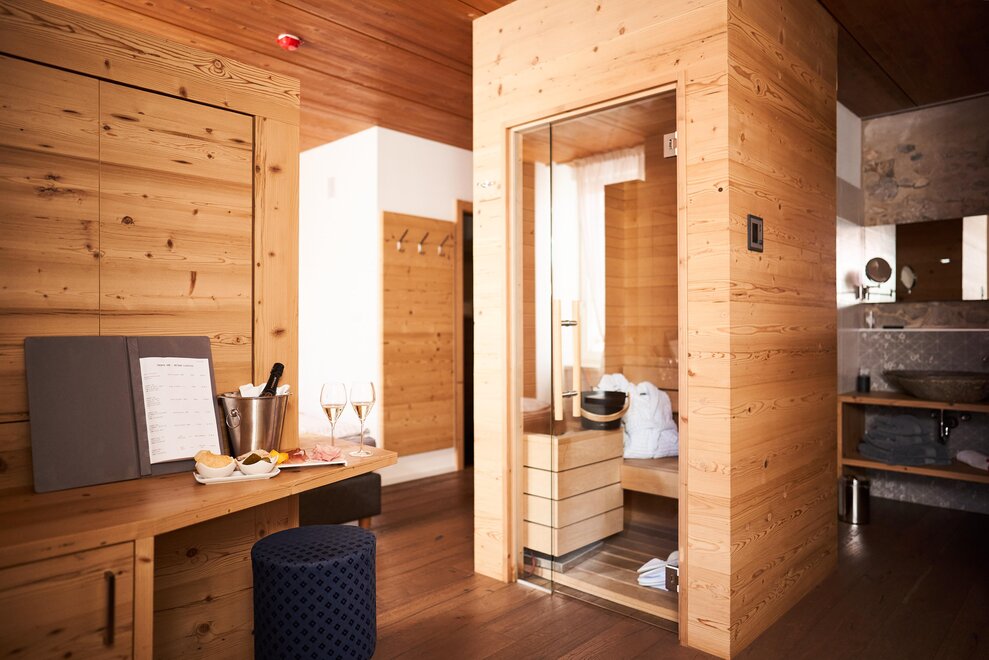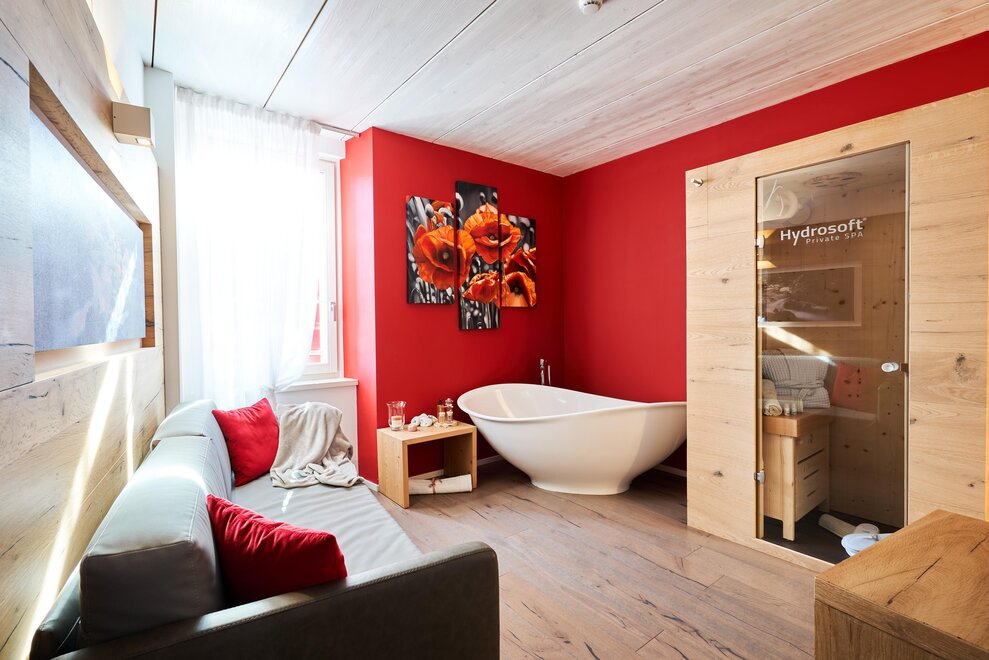 Pokój o powierzchni około 60 m² z podłogami i meblami drewnianymi, łóżko podwójne z materacem DORELAN z widokiem na góry i Zamek Thun, open space z BIO sauną Hydrosoft dla dwóch osób oraz wanną z hydromasażem dla dwóch osób z systemem utrzymania temperatury, własna łazienka z dużym przeszklonym prysznicem, oświetlona garderoba, sejf, minibar, kącik herbaty, telewizor LED i darmowe Wi-Fi.