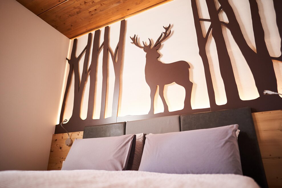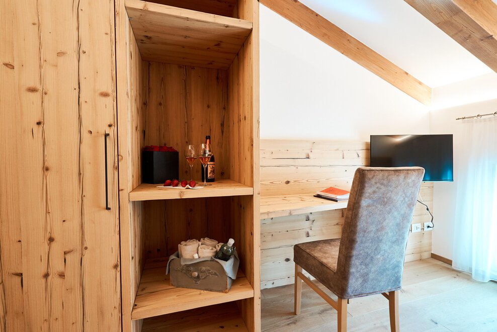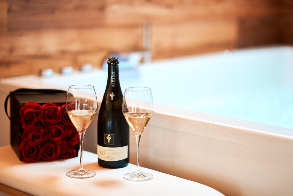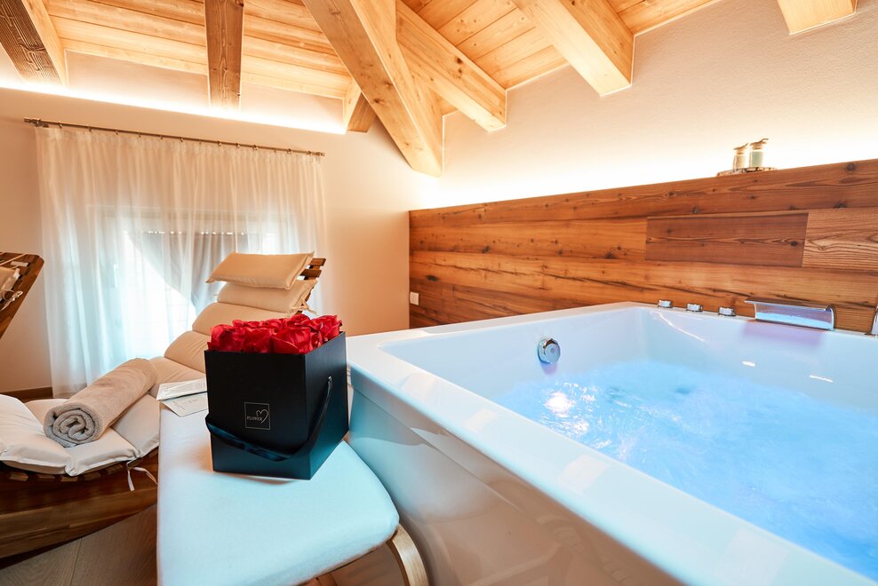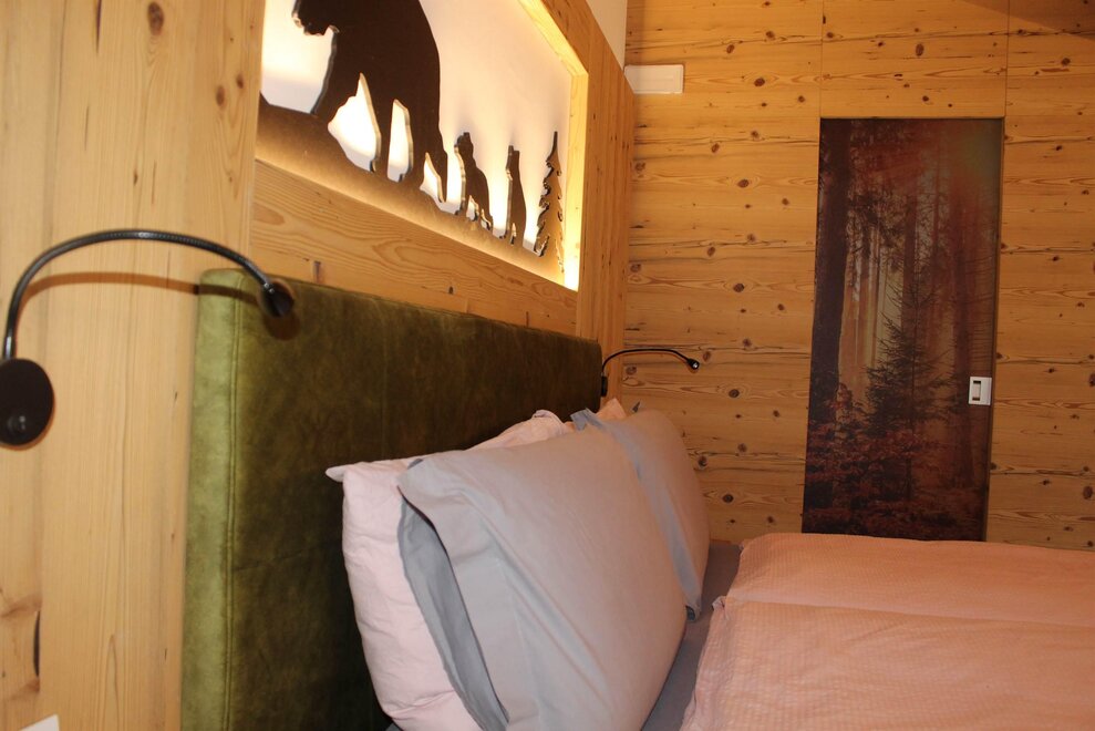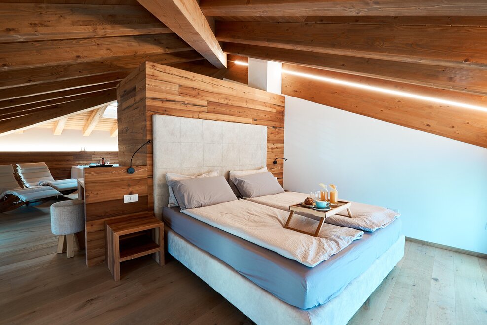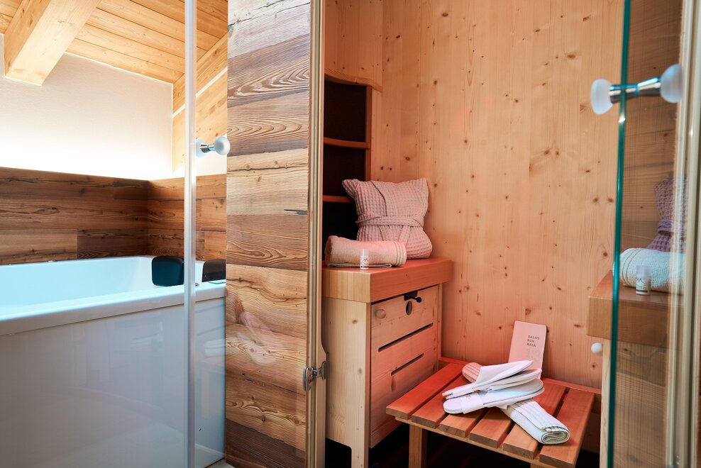Pokój o powierzchni około 60 m² z podłogami i meblami drewnianymi, łóżko podwójne z materacem DORELAN z widokiem na góry i Zamek Thun, open space z BIO sauną Hydrosoft dla dwóch osób oraz wanną z hydromasażem dla dwóch osób z systemem utrzymania temperatury, własna łazienka z dużym przeszklonym prysznicem, oświetlona garderoba, sejf, minibar, kącik herbaty, telewizor LED i darmowe Wi-Fi.