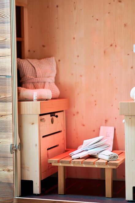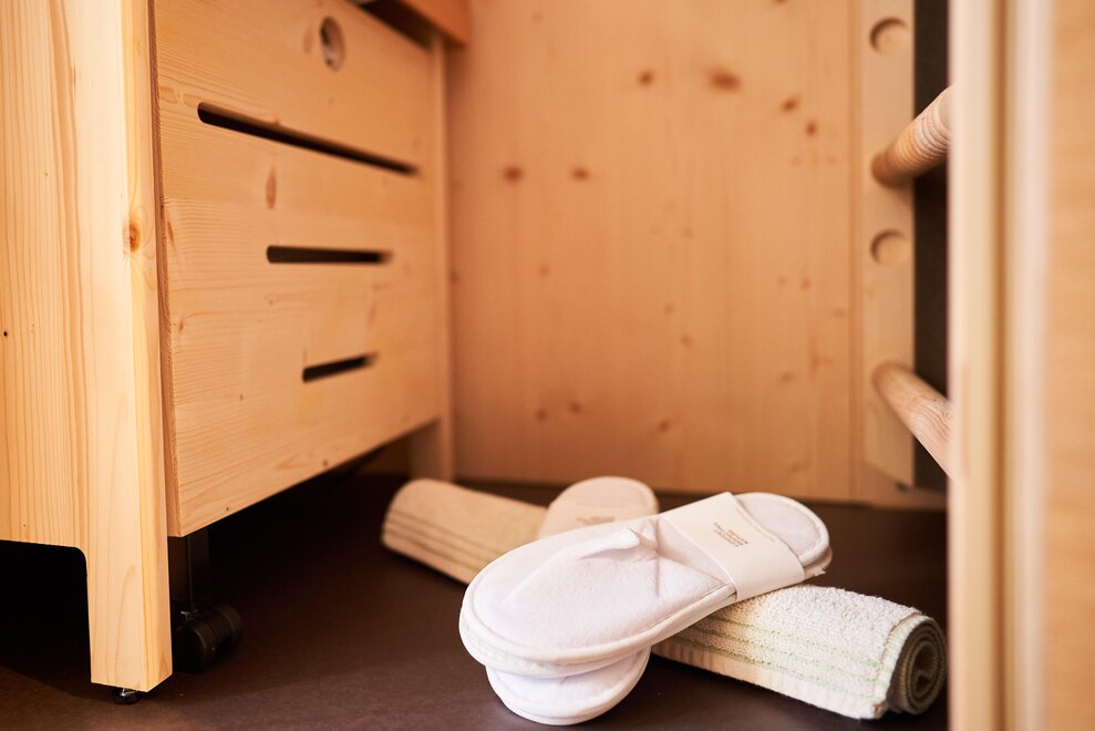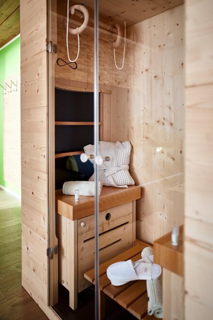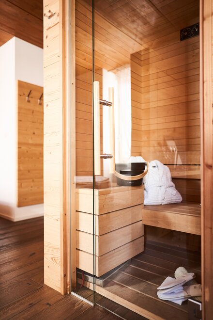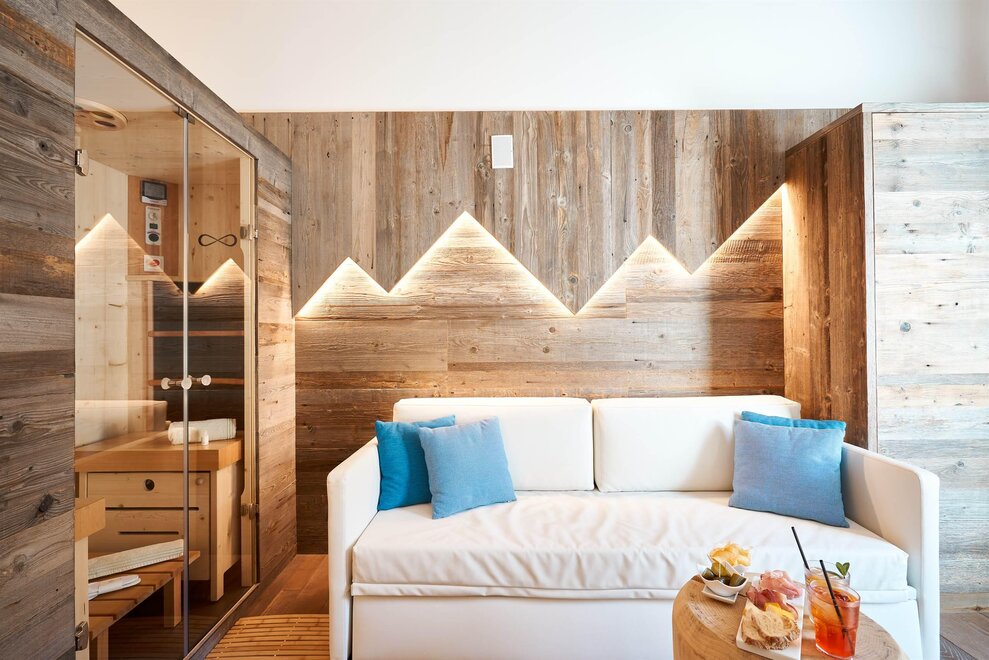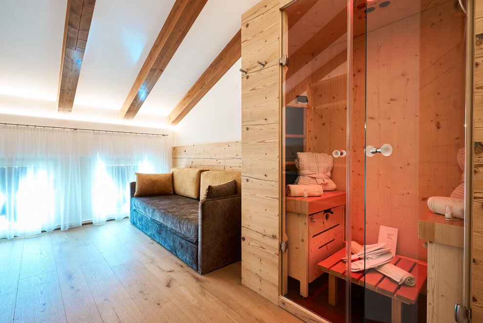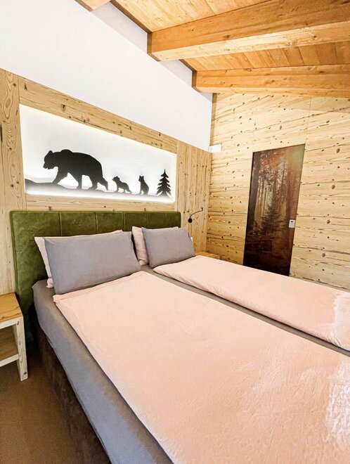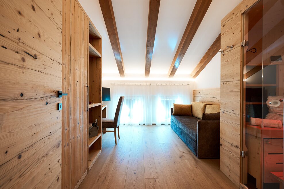 Pokój o powierzchni około 65 m² z drewnianymi podłogami i wyposażeniem w jasnych, neutralnych odcieniach, podwójne łóżko z materacami DORELAN, przylegający pokój z rozkładaną sofą dla jednej lub dwóch osób oraz BIO sauna Hydrosoft dla dwóch osób, własna łazienka z dużym szklanym prysznicem, oświetloną garderobą, sejfem, minibarem, kącikiem herbacianym, telewizorem LED i bezpłatnym Wi-Fi.