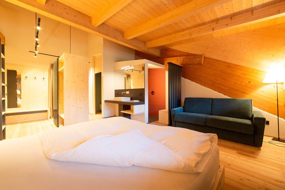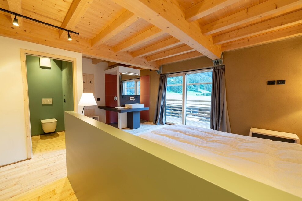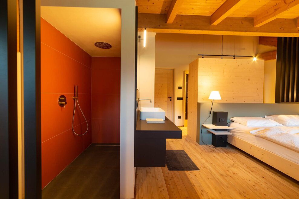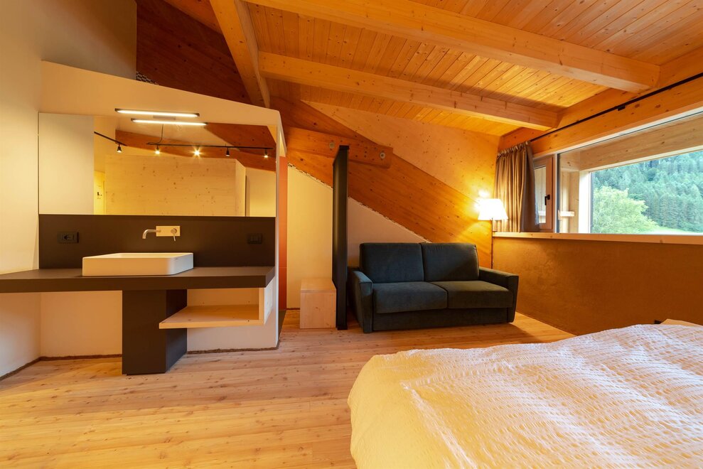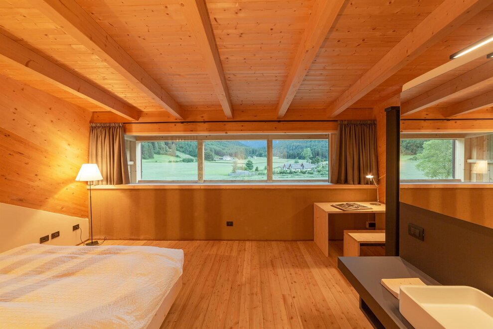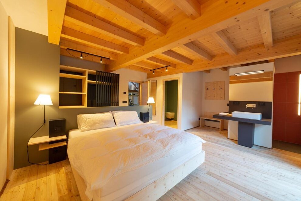 Największym atutem tego pokoju jest spektakularne okno panoramiczne o szerokości 5 metrów, skierowane na południe i na otaczające zbocza, z którego można podziwiać także Park Archeo Natura osad zalewowych w Fiavè. Znajduje się na drugim piętrze i dysponuje także kilkoma przeszklonymi ścianami, które pozwalają na utrzymanie kontaktu wzrokowego z różnymi wewnętrznymi i zewnętrznymi przestrzeniami typowymi dla tego miejsca. Wewnątrz znajduje się wygodne łóżko małżeńskie, a na życzenie dodatkowe łóżko, które komfortowo pomieści od 2 do 3 osób. Łazienka, wyposażona w toaletę, bidet i umywalkę, jest oddzielna, a prysznic i druga umywalka są na widoku. Wewnątrz docenisz wybór materiałów, które tworzą ciągłość z zewnętrzem i otoczeniem: podłoga z szczotkowanego drewna modrzewiowego w formie naturalnej, zapach jego esencji otaczający wnętrze, tynki gliniane i słomiane o różnych kolorach i wykończeniach przeniosą cię w czasie do okresu, gdy budynek był stodołą.