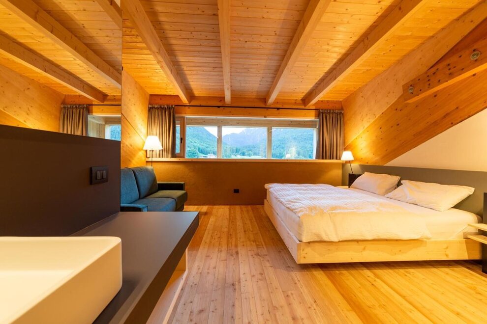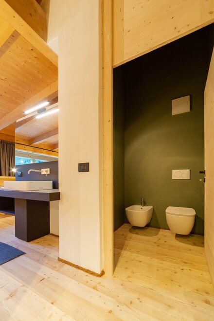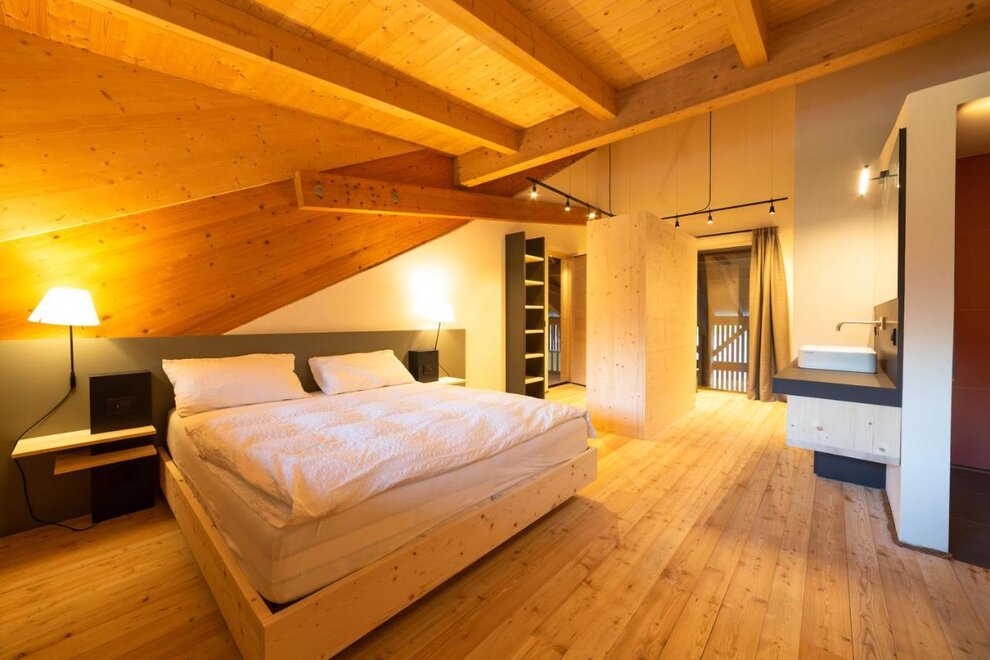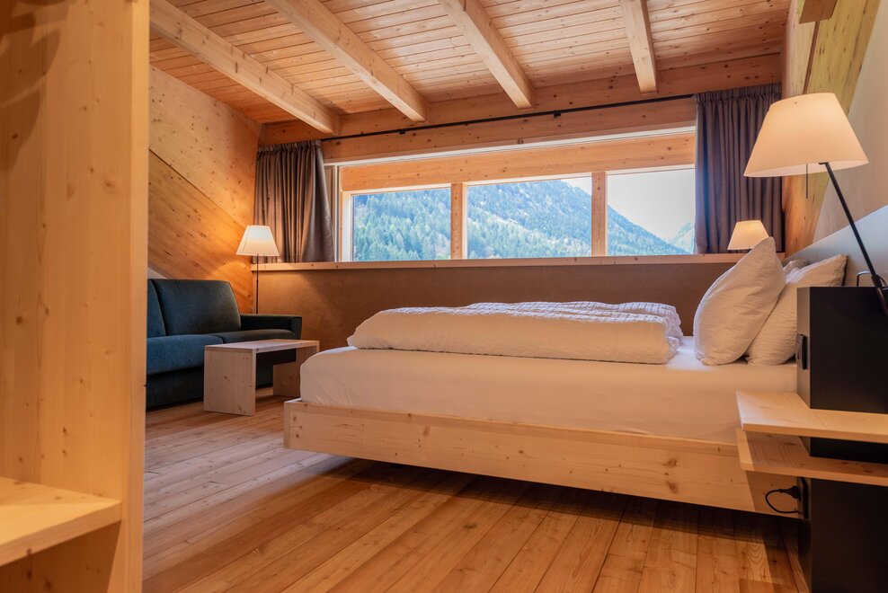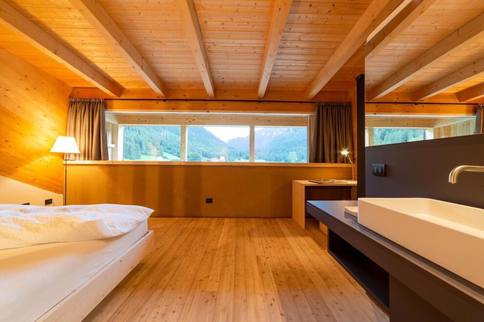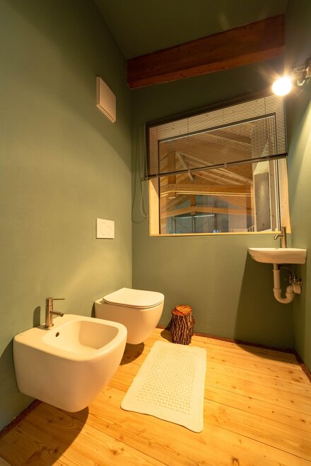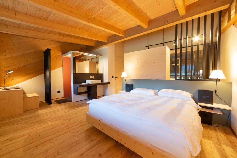 Największym atutem tego pokoju jest spektakularne okno panoramiczne o szerokości 5 metrów, skierowane na południe i na otaczające zbocza, z którego można podziwiać także Park Archeo Natura osad zalewowych w Fiavè. Znajduje się na drugim piętrze i dysponuje także kilkoma przeszklonymi ścianami, które pozwalają na utrzymanie kontaktu wzrokowego z różnymi wewnętrznymi i zewnętrznymi przestrzeniami typowymi dla tego miejsca. Wewnątrz znajduje się wygodne łóżko małżeńskie, a na życzenie dodatkowe łóżko, które komfortowo pomieści od 2 do 3 osób. Łazienka, wyposażona w toaletę, bidet i umywalkę, jest oddzielna, a prysznic i druga umywalka są na widoku. Wewnątrz docenisz wybór materiałów, które tworzą ciągłość z zewnętrzem i otoczeniem: podłoga z szczotkowanego drewna modrzewiowego w formie naturalnej, zapach jego esencji otaczający wnętrze, tynki gliniane i słomiane o różnych kolorach i wykończeniach przeniosą cię w czasie do okresu, gdy budynek był stodołą.