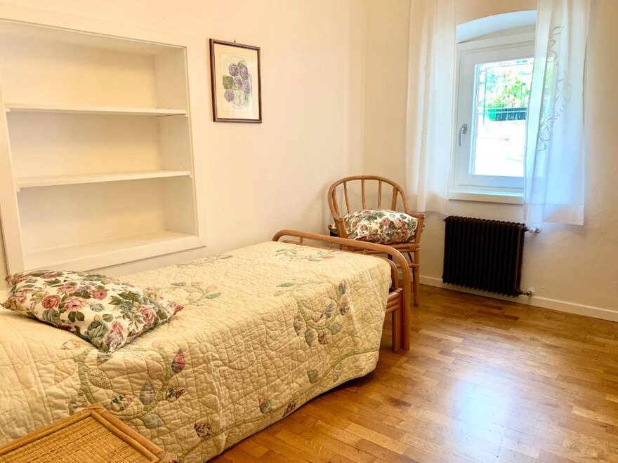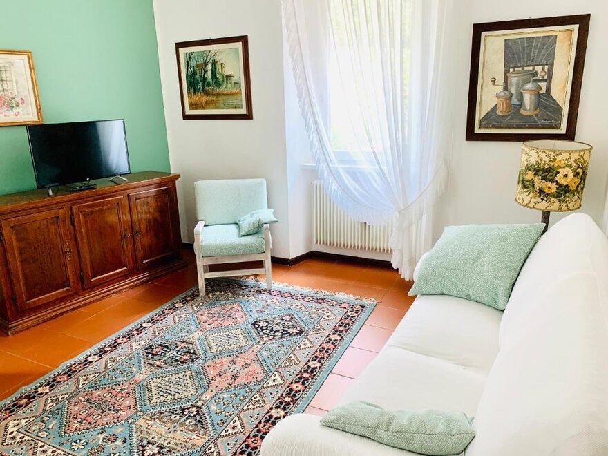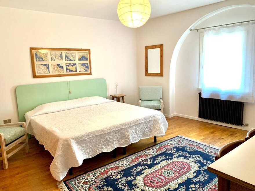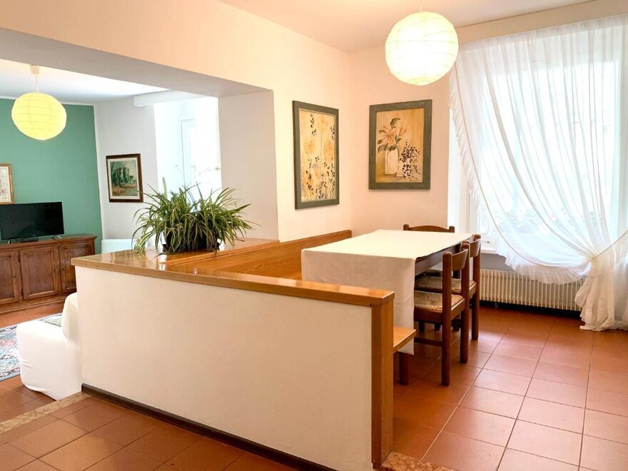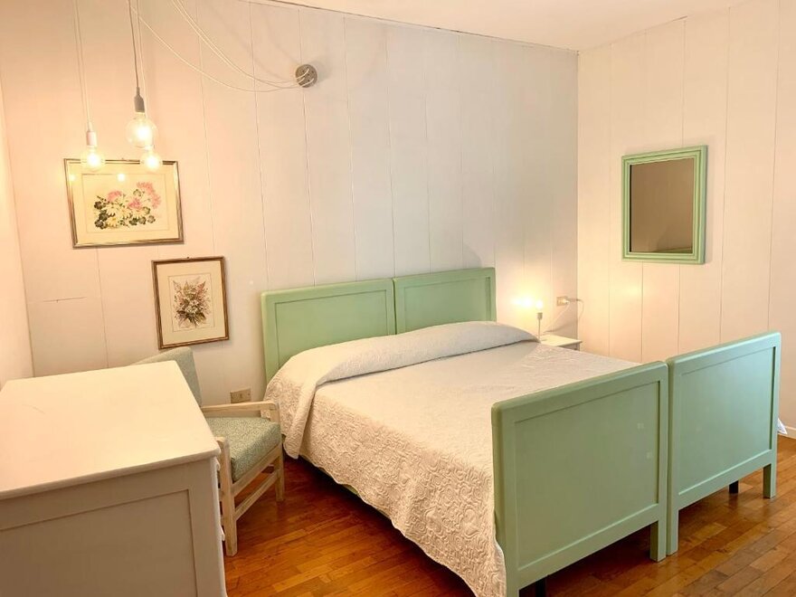 Apartament znajduje się na pierwszym piętrze starego, odnowionego domu z niezależnym wejściem, składa się z trzech pokoi (dwóch sypialni podwójnych i jednego pojedynczego), łazienki, spiżarni, salonu oraz kuchni z jadalnią, wyposażonej w sprzęt AGD (łącznie 120 m²).