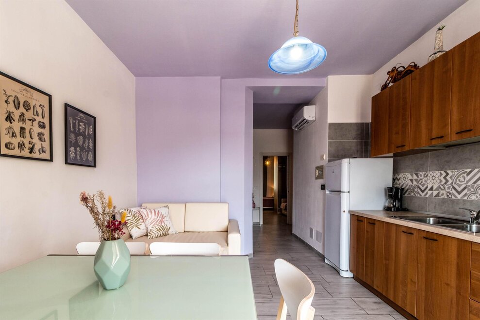 W salonie znajduje się sofa, w pełni wyposażona kuchnia, stół jadalny, telewizor, WiFi, klimatyzacja.