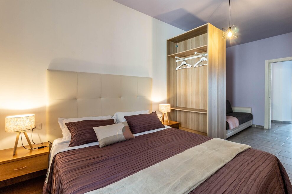 Główna sypialnia ma duże łóżko małżeńskie i jedno łóżko pojedyncze.