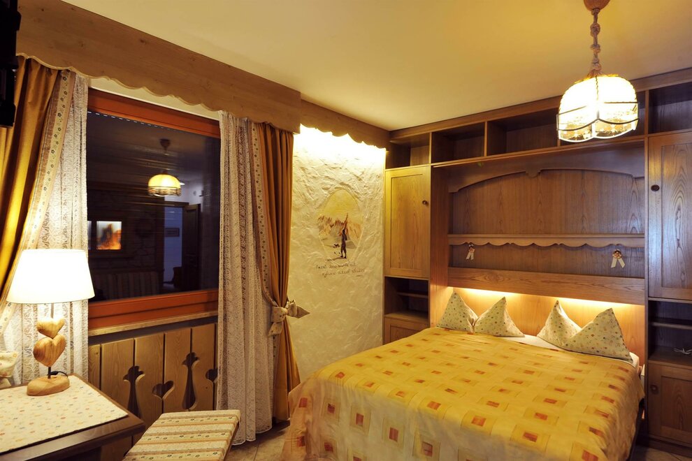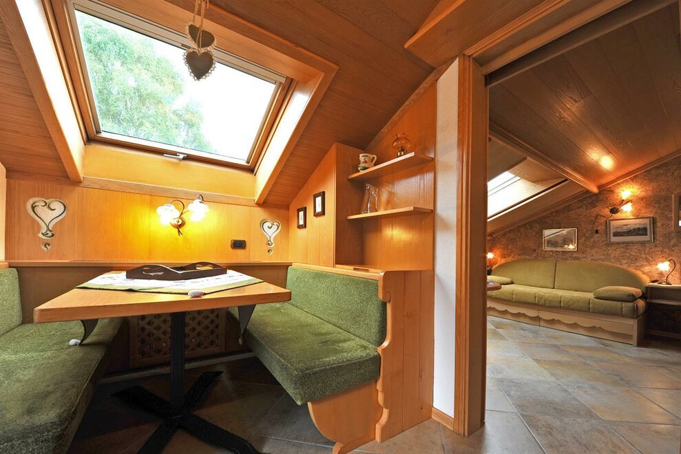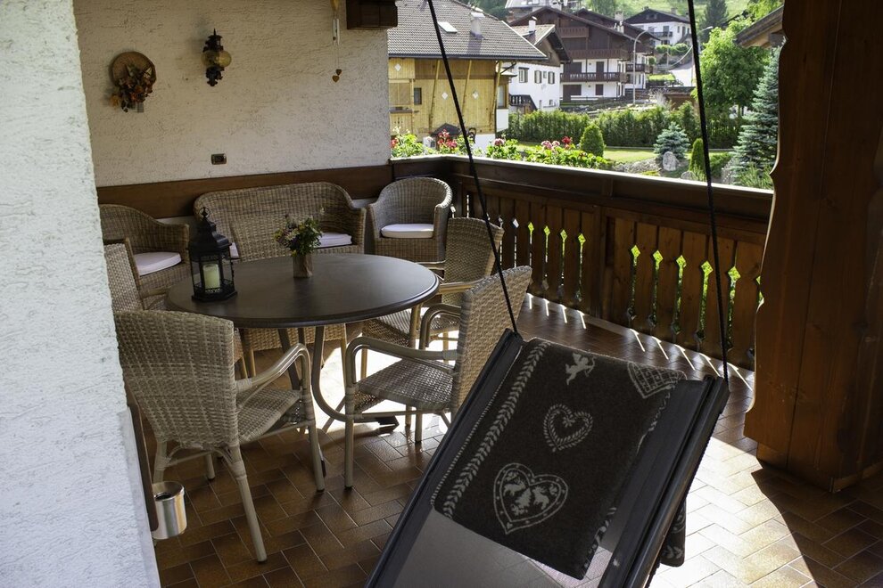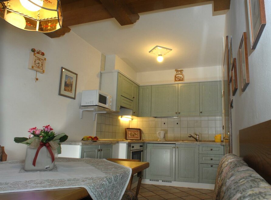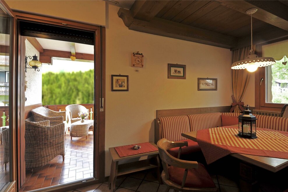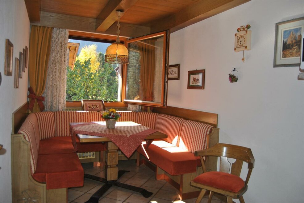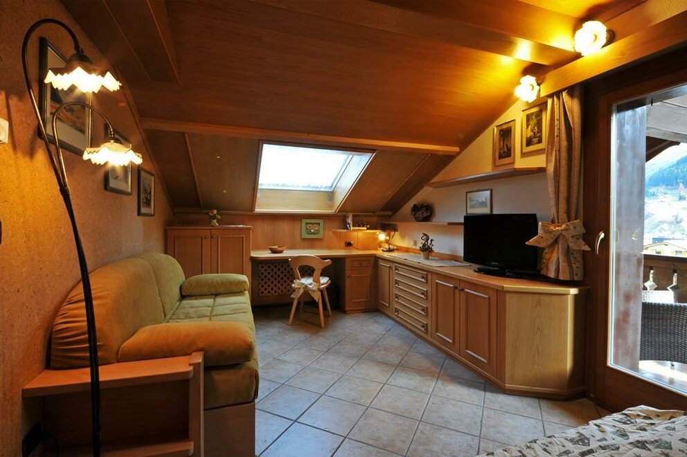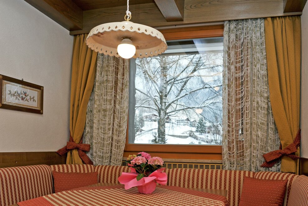 Apartment furnished with all comforts: a fully equipped kitchen with oven, microwave, crockery and cosy dinner corner, and a large balcony with deckchairs, wireless Internet connection, TV sat, thelepone and safe. Our guests can access the ground-floor, where swimming-pool, sauna, infrared sauna, games-room and laundry-ironing room are provided. At their disposal is also a welcoming lounge with garden view. For each apartment is available one car park in our garage, where are also provided a ski boot drier and some mountain-bikes for the summer excursions of guests.