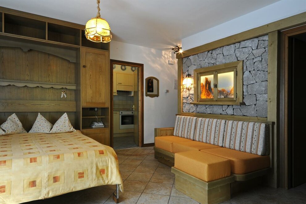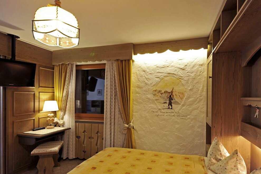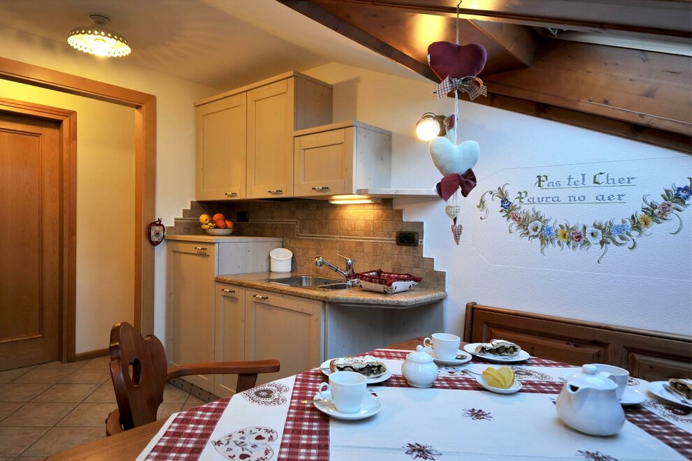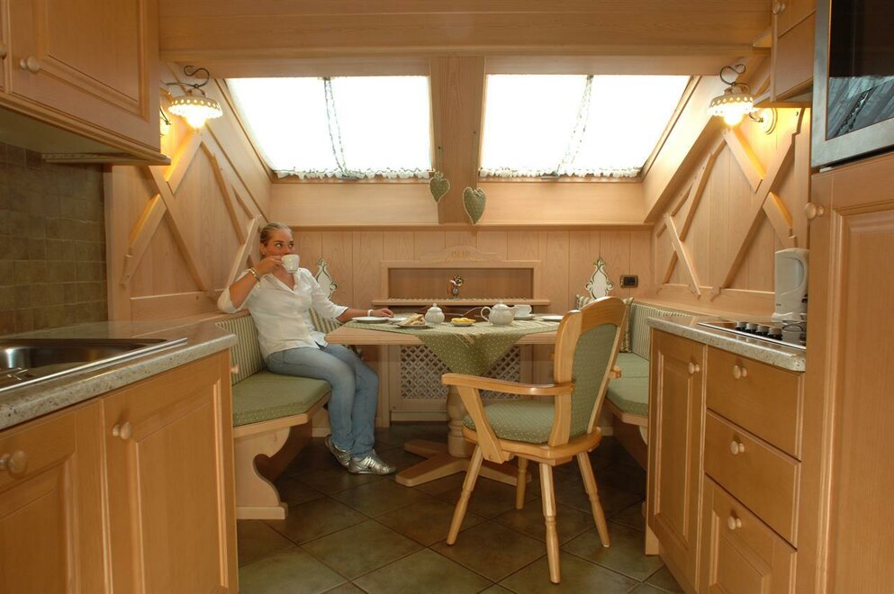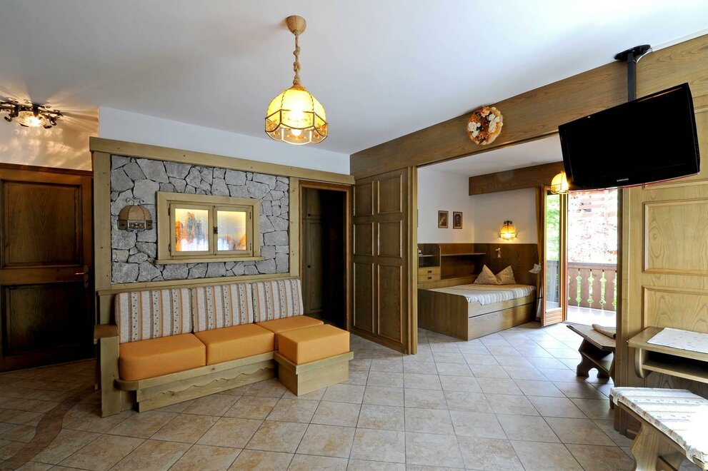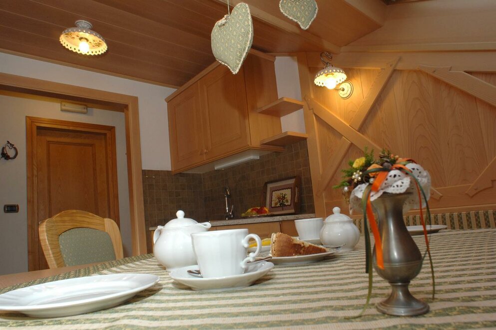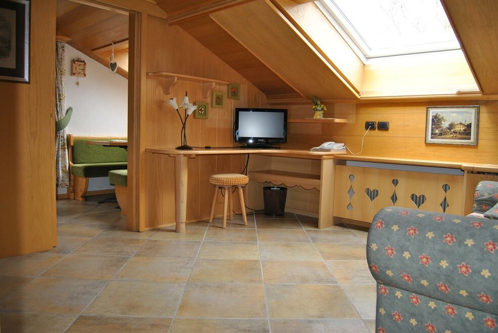 Apartment furnished with all comforts: a fully equipped kitchen with oven, microwave, crockery and cosy dinner corner, and a large balcony with deckchairs, wireless Internet connection, TV sat, thelepone and safe. Our guests can access the ground-floor, where swimming-pool, sauna, infrared sauna, games-room and laundry-ironing room are provided. At their disposal is also a welcoming lounge with garden view. For each apartment is available one car park in our garage, where are also provided a ski boot drier and some mountain-bikes for the summer excursions of guests.