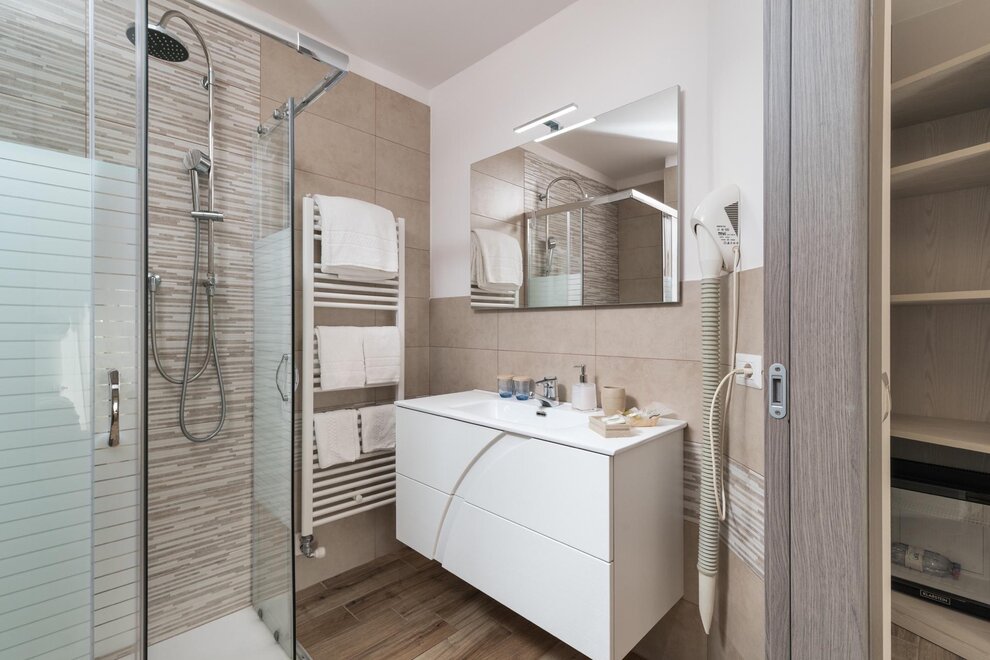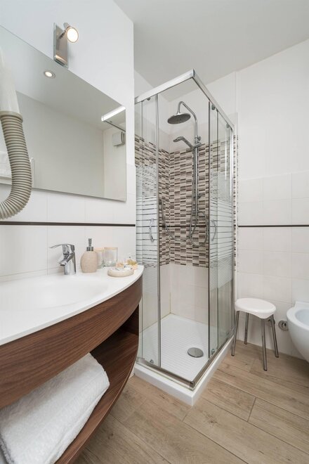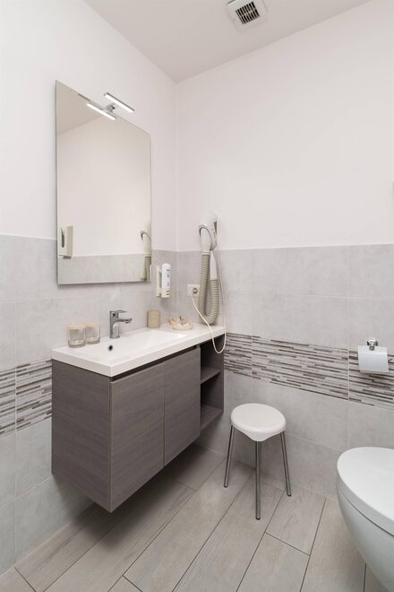 bieżąca woda ciepła/zimna, prysznic lub wanna, umywalka, WC, bidet