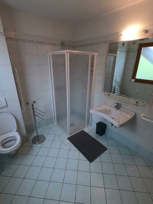 emergency call button in the bathroom, entire unit located on the ground floor, accessible bed, accessible walk-in shower, no stairs or steps to enter, ample space in the shower and bathroom, toilet with grab bars