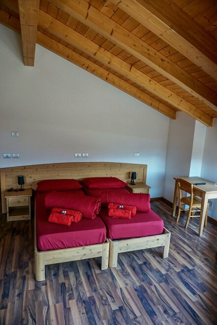 Четырехместный номер (две смежные комнаты) с балконом и видом на долину. В номере есть два туалета, оба состоят из унитаза, бидета и душа. Номер оборудован телевизором, постельным бельем, полотенцами и туалетными принадлежностями.