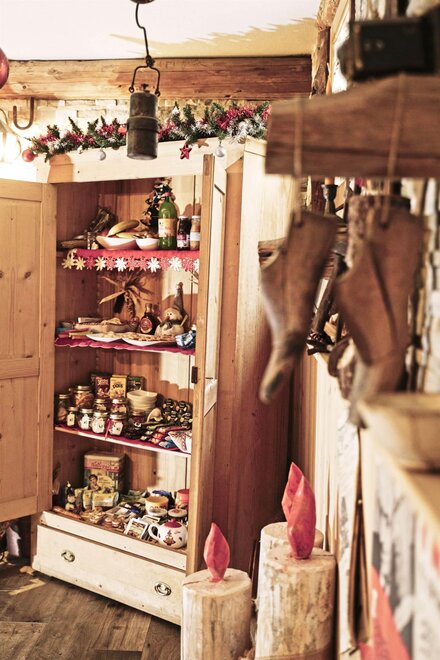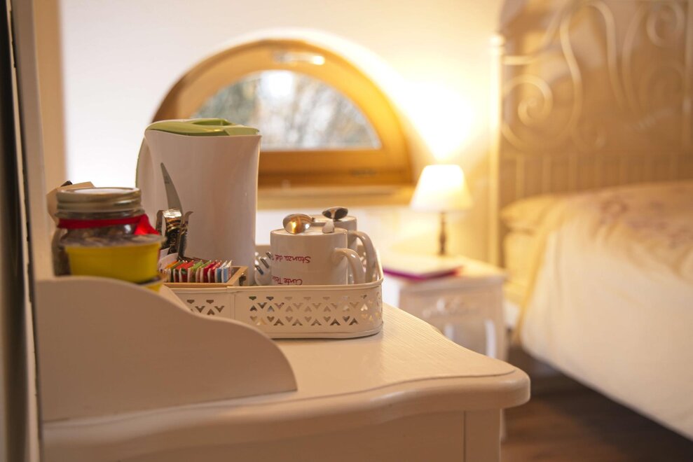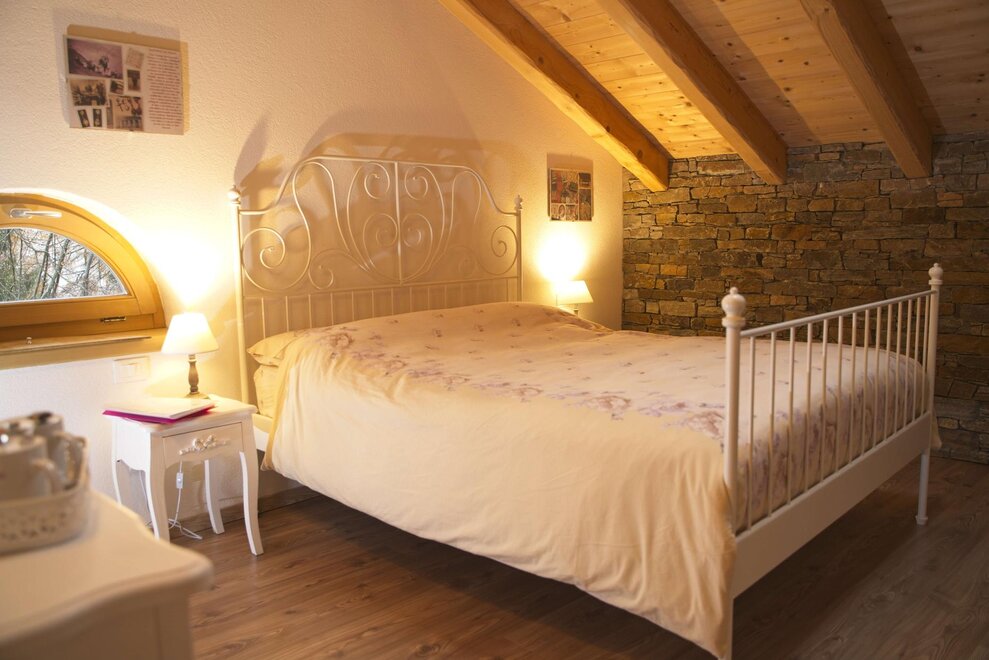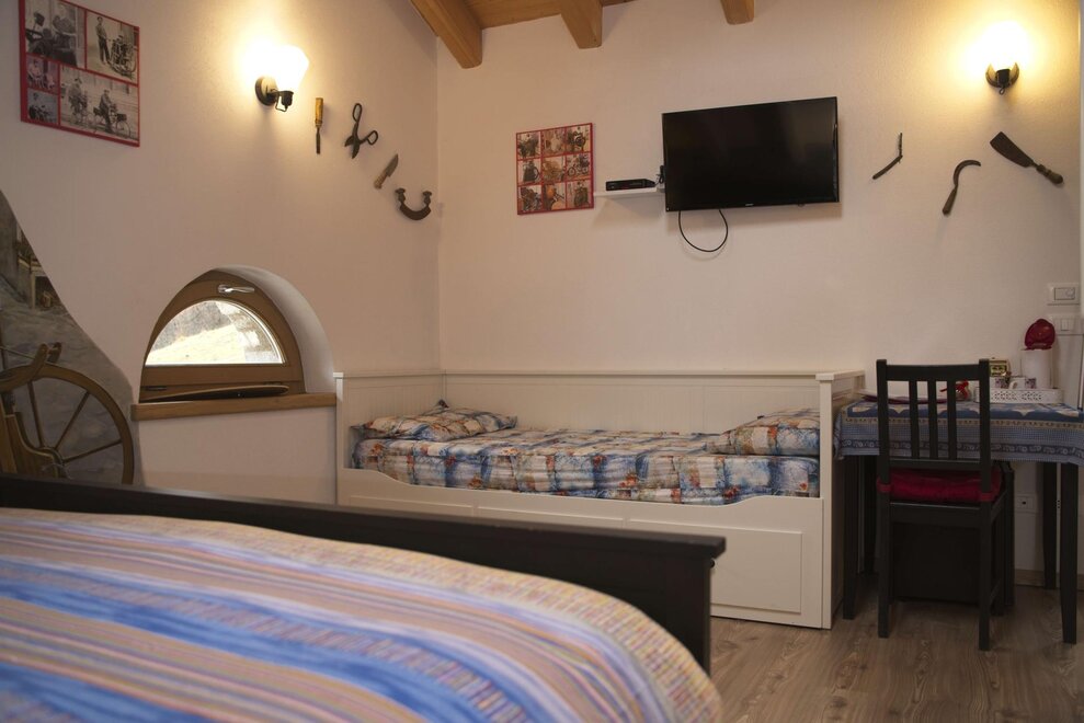 КОМНАТА ПЕРТЕГАНТОВ С конца 1600-х до 1920 года из Тезино отправлялось много торговцев, которые, естественно, путешествовали пешком с пертагами, откуда и пошло название Пертагандо. Изначально они торговали кремнями, позже — гравюрами, а в 1900-х годах привозили по всей Европе товары различного рода: от бритв до очков, молитвенных карточек, мыла, семян, иголок, наперстков и других товаров. Некоторые из них разбогатели и открыли множество магазинов. Вот почему эта комната оформлена в изящном и романтичном стиле конца 1800-х годов, с красивым умывальником и кувшином из кованого железа. В комнате есть собственная ванная комната, телевизор, чайник с чаем и травяными настоями, свежие или сушеные фрукты, закуски, фен, постельное и банное белье.