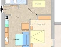 Расположен на первом этаже, площадь 48 кв.м, двухкомнатный + с 5 местами для сна (2 в спальне, 2 в части гостиной, которая закрывается раздвижной стеной, 1 место на раскладном диване).