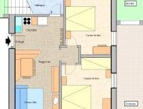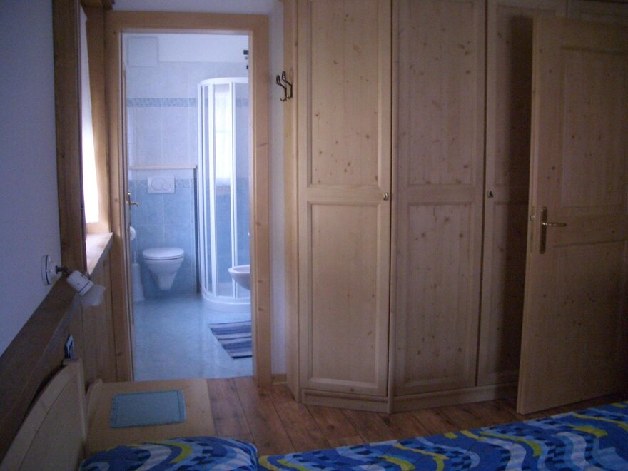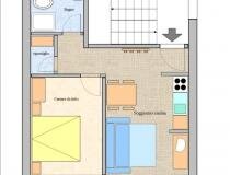 Расположен на втором этаже (мансарда) площадью 60 м2, четырехкомнатная квартира с местами до максимума 8 кроватей. Две спальни с двуспальными кроватями, одна из которых с душем, одна комната для одного или двоих с двуспальной кроватью, второй санузел с ванной, гостиная с кухонным уголком с посудомоечной машиной и микроволновой печью. Wi-Fi. Спутниковое телевидение, отопление с подогревом пола с автономным управлением. В распоряжении прачечная.