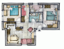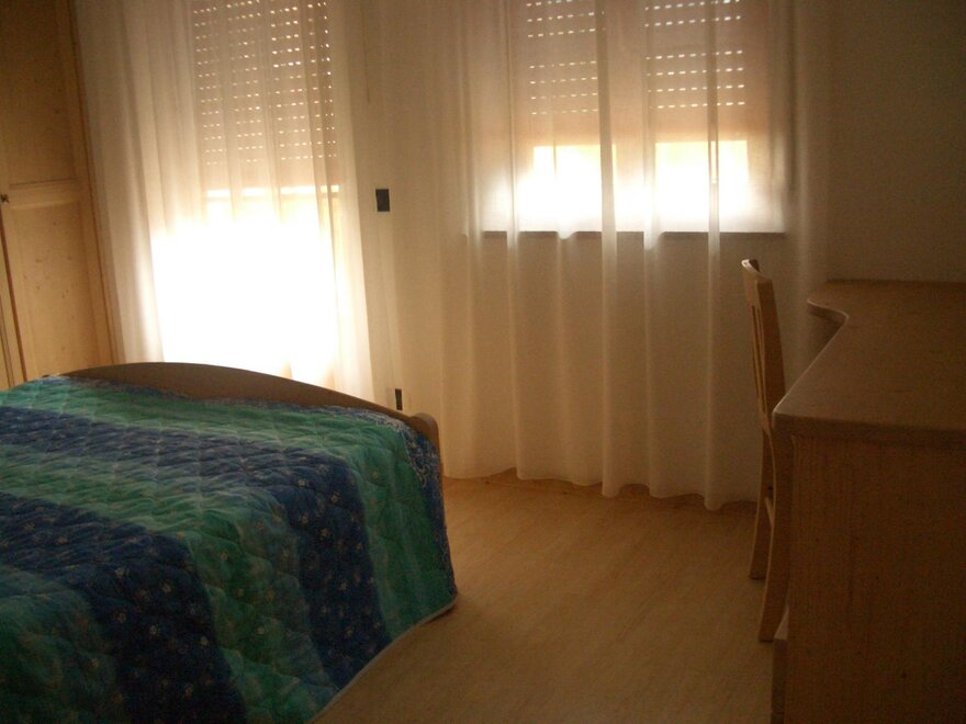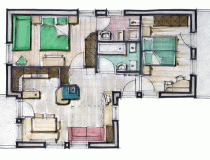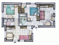 Расположена на первом этаже, площадью 60 м2, окружена зеленью, с балконом на юг и террасой на восток. Четырехкомнатная квартира с максимальным количеством 8 спальных мест. Три двуспальные комнаты, гостиная с диваном-кроватью. Одна ванна с душем и второй туалет с ванной. Wi-Fi, спутниковое телевидение, микроволновая печь, подогрев пола с автономным управлением. В распоряжении прачечная.