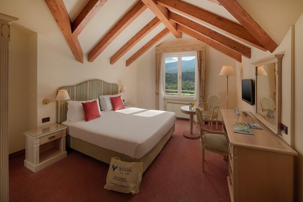Двухместный номер имеет стандартный размер около 17 м². В этом типе номера мебель и ванная комната еще не были обновлены, но номер оснащен всеми удобствами и особым видом на наше озеро Левико. Подходит для тех, кто хочет совместить активный отдых на природе с расслаблением, предлагаемым нашим спа-центром "BellaVita". Включенные услуги: - Этот номер не оборудован кондиционером, но есть удобный настольный вентилятор. - вход в наш спа-центр "Bellavita" - косметичка с халатом, полотенцем для бассейна и мягкими тапочками - вход в бассейн с подогревом 28° - вход в фитнес-центр - открытая парковка