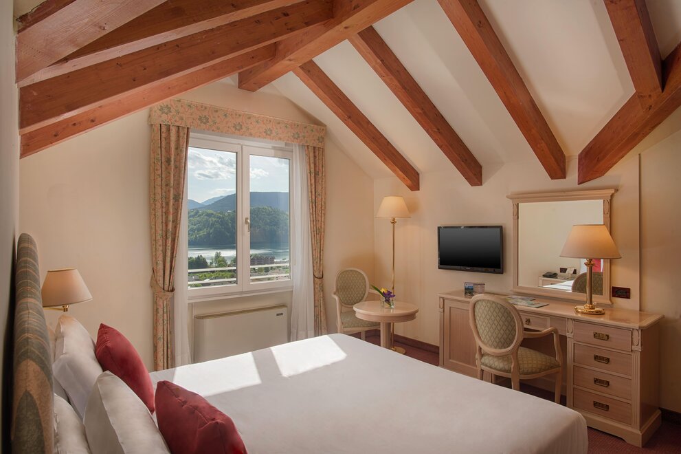Our Junior Suite is our most romantic room, measuring approximately 37 sqm with a 63 sqm balcony. Perfect for a couple's vacation, it features a wonderful balcony with a lake view, equipped with sun loungers and an umbrella: a gem for an unforgettable stay with your loved one. Renewed and elegant, it is the perfect room for a relaxing holiday: it goes beyond a simple room, it is rather an ideal space to experience moments of peace, joy, and tranquility. Included services: - air conditioning - spacious terrace of 63 sqm - access to our wellness center "Bellavita" - access to the heated swimming pool at 28° - access to the fitness center - garage