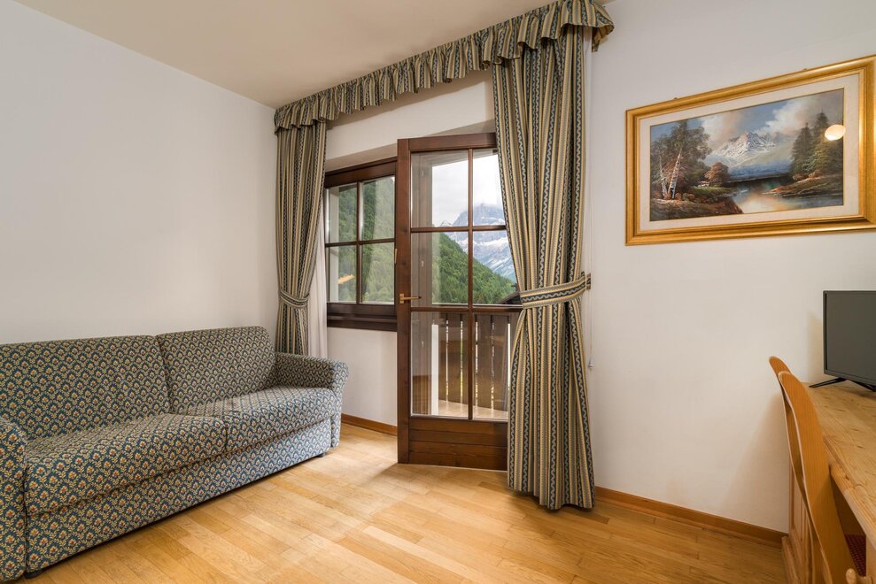 Наша двойная комната - это идеальное место для тех, кто ищет комфорт и дополнительное пространство. Обстановка, оформленная с использованием горного дерева, создает теплую и уютную атмосферу, характерную для альпийских традиций. Широкое окно и личный балкон позволяют насладиться захватывающим видом на величественные Доломиты Брента, даря погружающий в природу опыт.