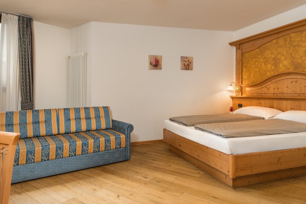 Наша трёхместная комната (28 м²), недавно обновлённая, приветствует вас в великолепной обстановке Доломитов. Тёплые оттенки дерева и качественные материалы создают яркую и расслабляющую атмосферу. Идеальное убежище, где комфорт и природа встречаются, чтобы вы сразу почувствовали себя как дома.