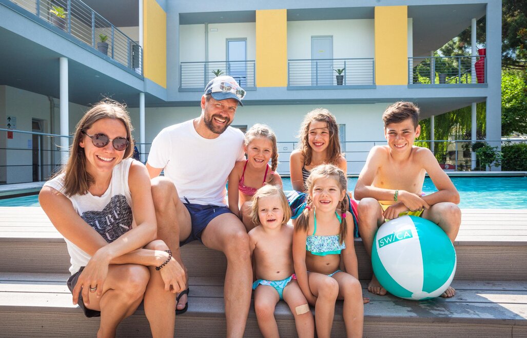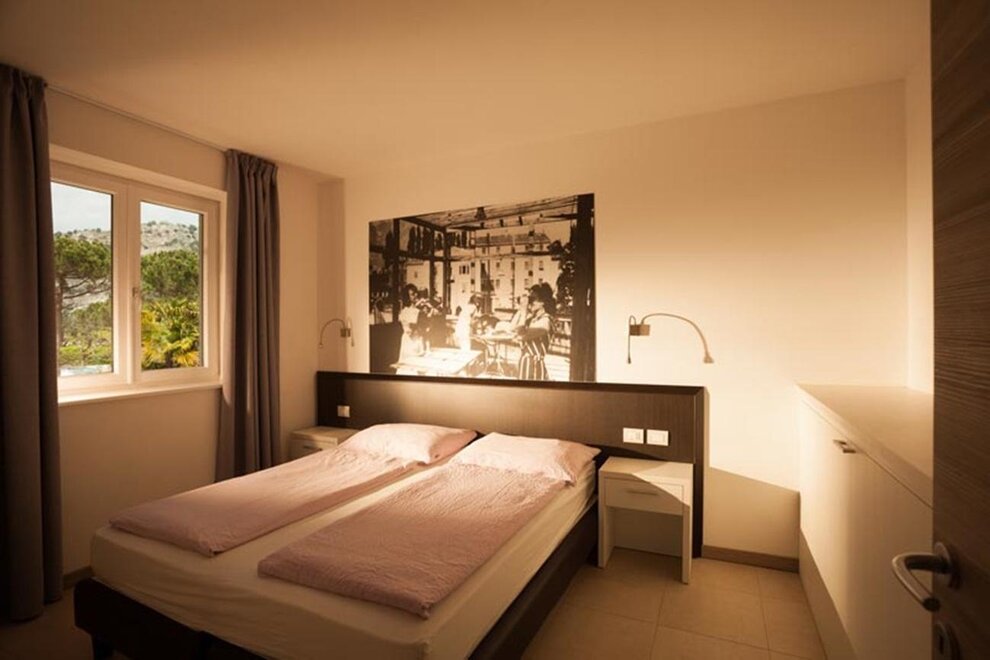 Апартаменты находятся на первом этаже нового здания, имеют террасу с видом на озеро и новый бассейн. В них предусмотрено 3 спальных места, а также возможность установки детской кроватки для ребенка до 3 лет. Единица предназначена для семейных групп из 3 взрослых или до 4, если это семья.
