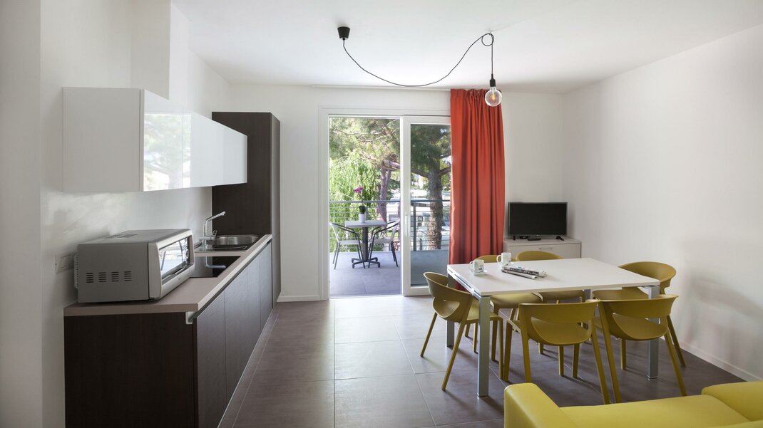 Квартира, которая может разместить семью из максимум 5 человек или 2 пары друзей. Ориентированная на юго-запад, она обладает преимуществом просторной крытой вераанды, которая вместе с гостиной объединяет жилую зону в единое пространство площадью 40 м². Квартира без каких-либо архитектурных барьеров доступна для людей с ограниченными возможностями. Если в группе будет инвалид, ему будет предоставлено приоритетное право.