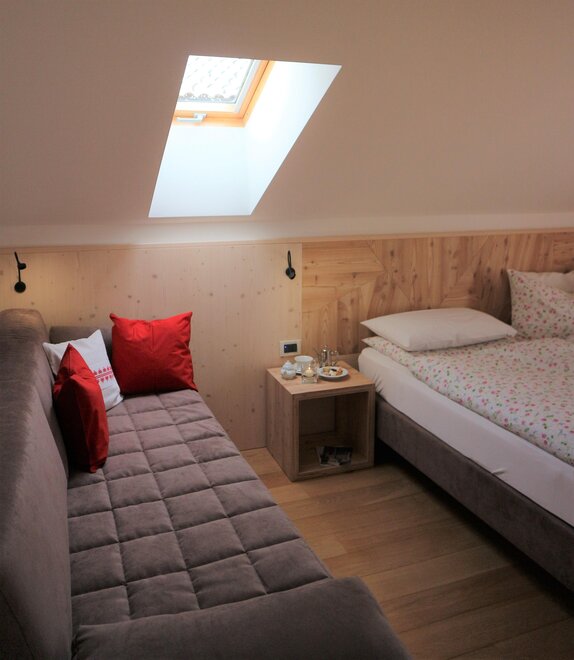 Панорамный двух- или трехместный номер в Вал ди Фьемме. Оснащен 1 двуспальной кроватью (или двумя односпальными по запросу) и 1 односпальным диваном-кроватью. Имеется собственная ванная комната с туалетом, душем и биде.