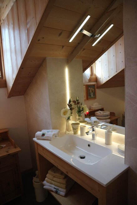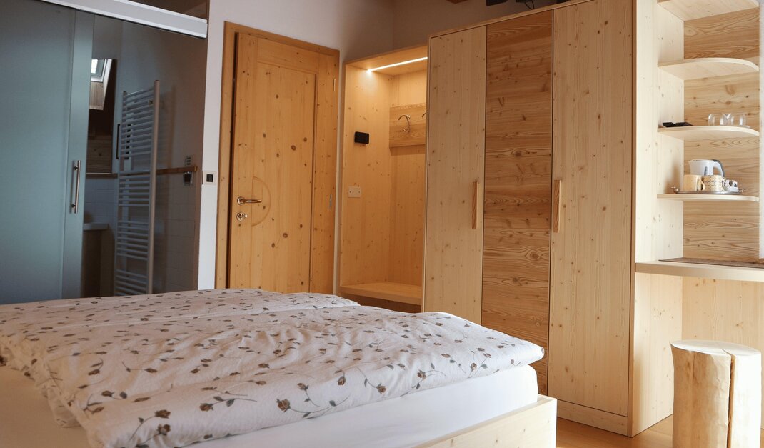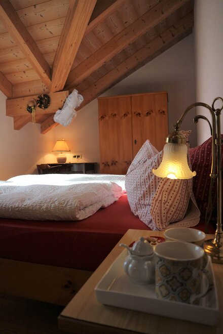 Двухместный панорамный номер в Валь ди Фьемме. Оснащен 1 двуспальной кроватью (или двумя односпальными кроватями по запросу). Имеет собственную ванную комнату с туалетом, душем и биде.