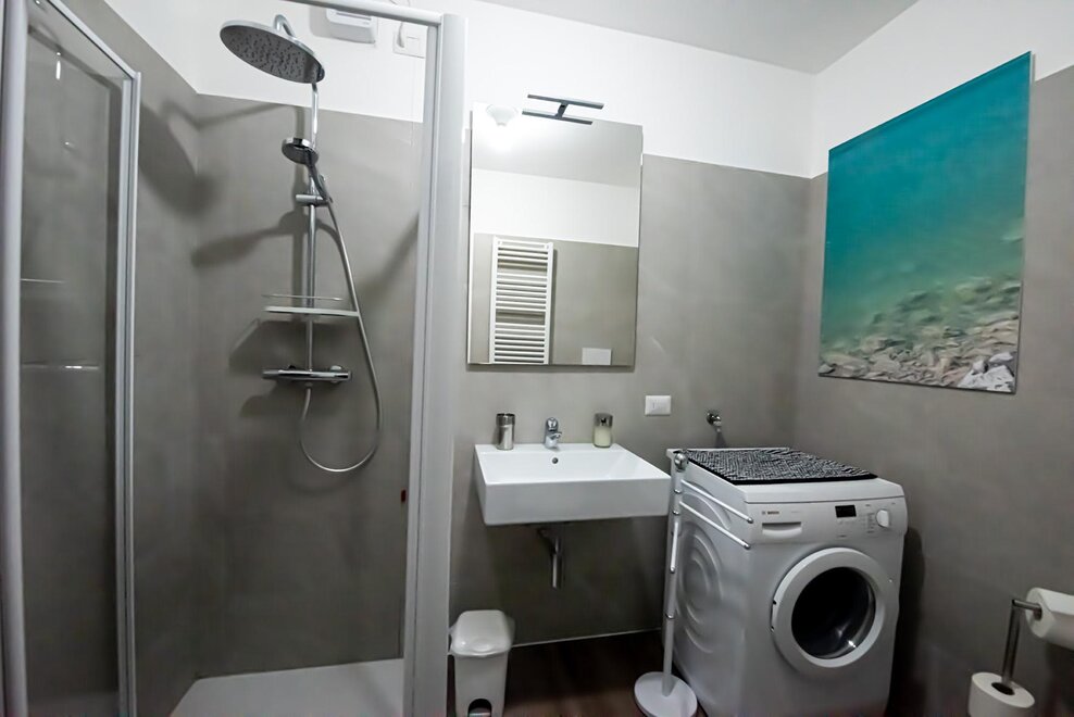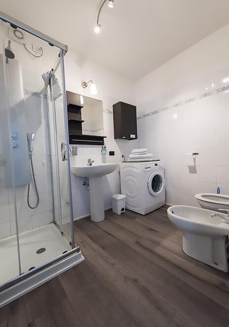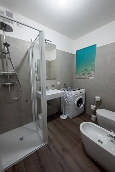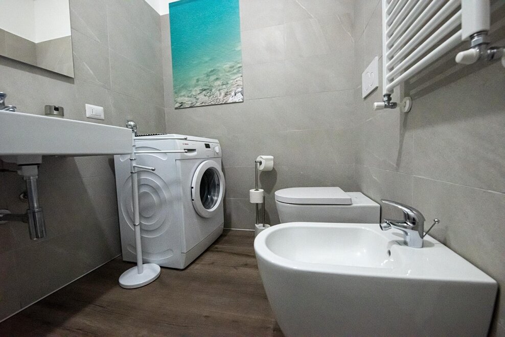 С ванной комнатой с феном, стиральной машиной, биде, душем.