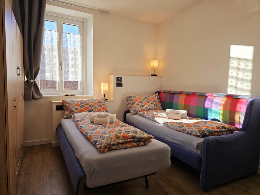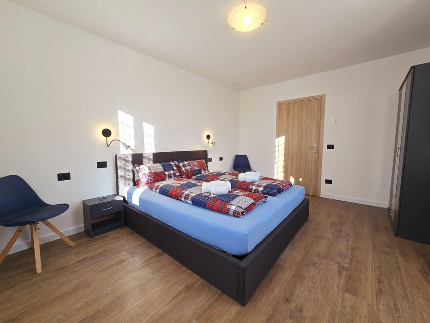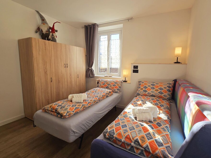 Квартира состоит из спальни с двуспальной кроватью, спроектированной для максимального комфорта, и второй спальни с двумя односпальными кроватями, что добавляет игривый и уютный штрих. Пространства, оформленные с заботой, предлагают все удобства для приятного и беззаботного отдыха.