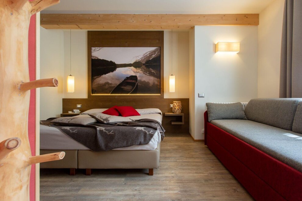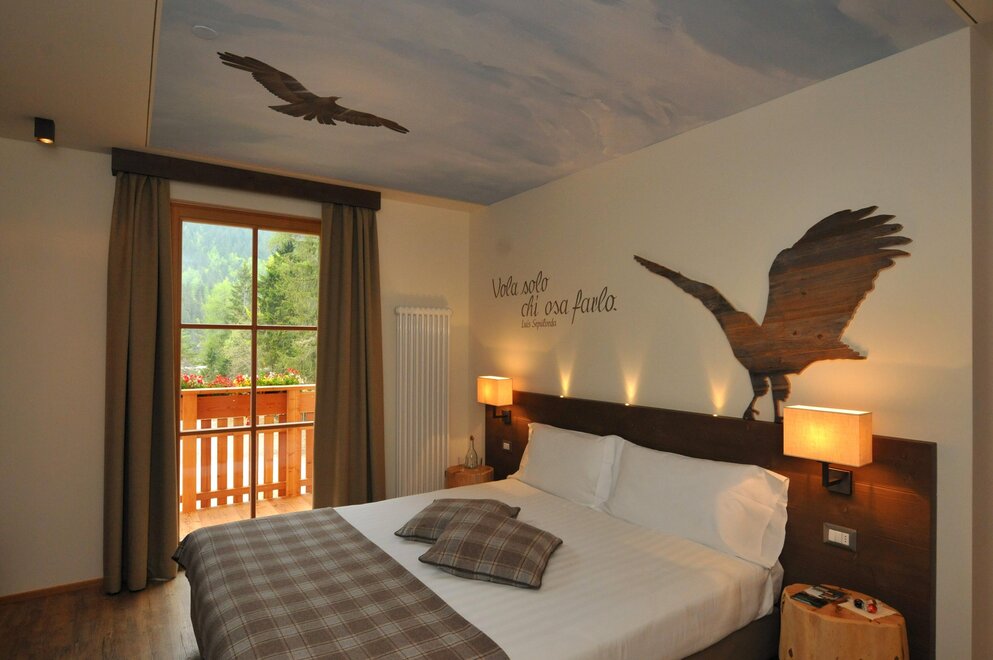 Просторные и светлые помещения, с расслабляющими оттенками, где можно отдаться медленным ритмам. Уютные и защищающие гнёзда, чтобы убаюкать твои сладкие мечты. Ты вновь ощутишь всё очарование величественных доломитовых вершин: магию их легенд и притяжение, и силу их устремления к голубому небу… чтобы почувствовать себя на шаг ближе к раю. Позволь своим мечтам быть убаюканными медленным течением воды… Во всех двухместных номерах ты сможешь найти: ванну с душем, панорамный балкон, отопление, телевизор, фен, сейф, рабочее место.