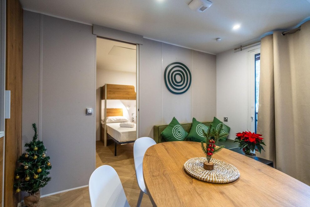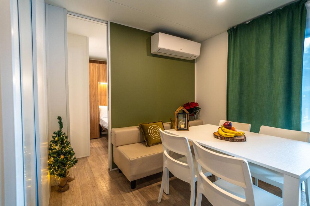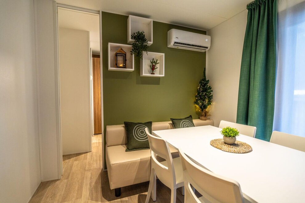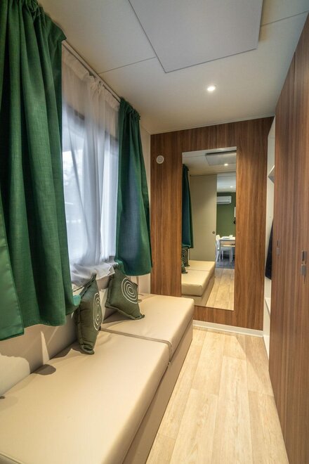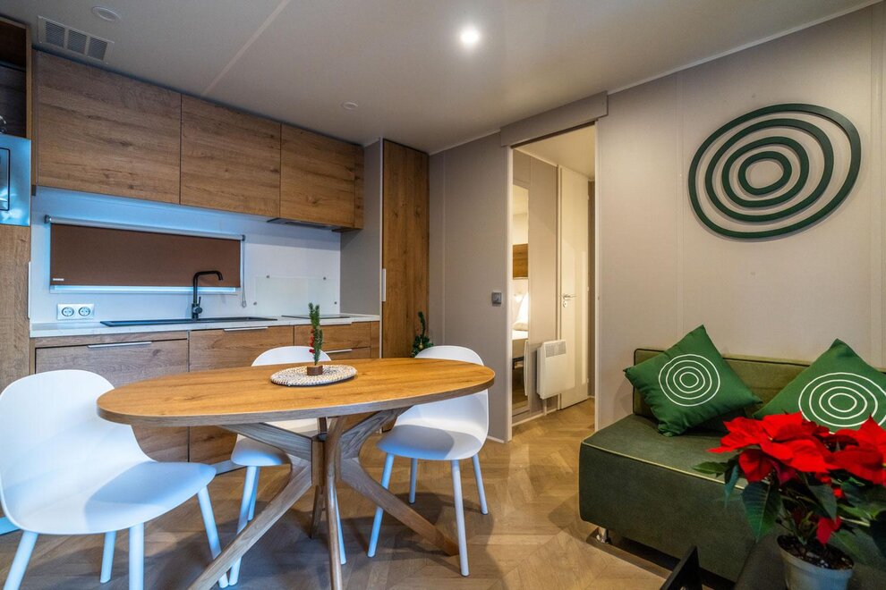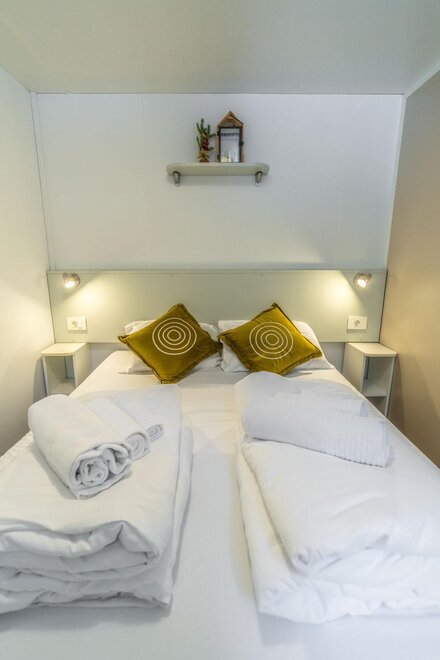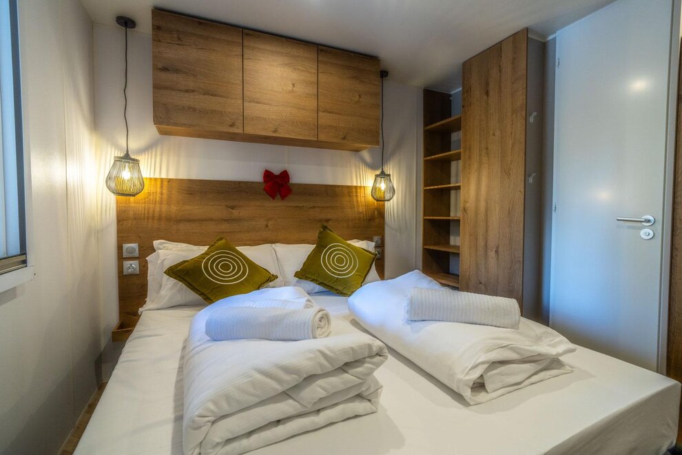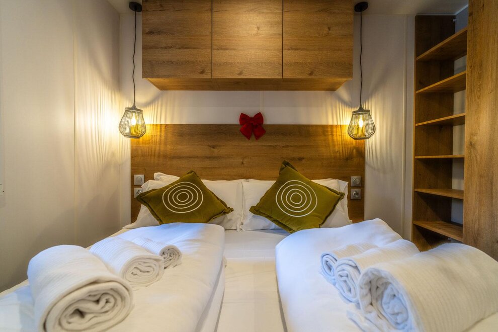 Допускаются животные. Мобильный дом площадью 24 кв.м с полукрытой верандой. Имеется одна спальня с двуспальной кроватью, одна спальня с 2 односпальными кроватями. Кухонный уголок с оснащенной кухней, холодильником, столом, стульями Иванию, телевизором, кондиционером, туалетом и ванной с душем. Максимальная вместимость - 4 человека. Парковочное место в деревне.