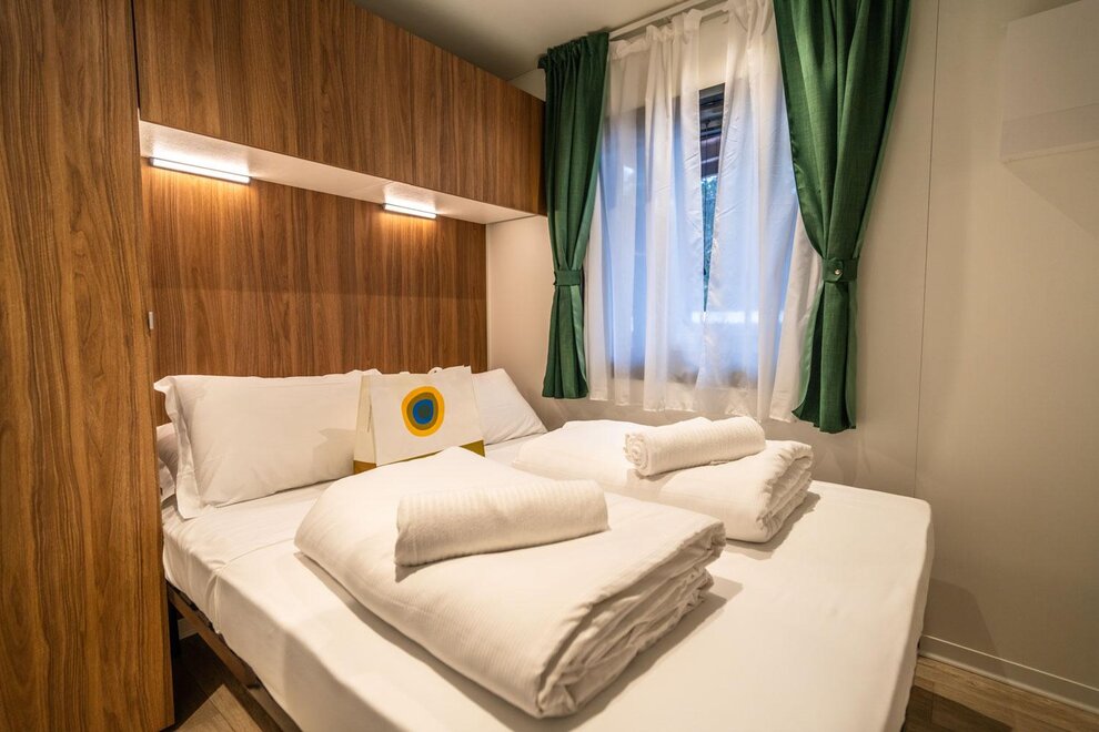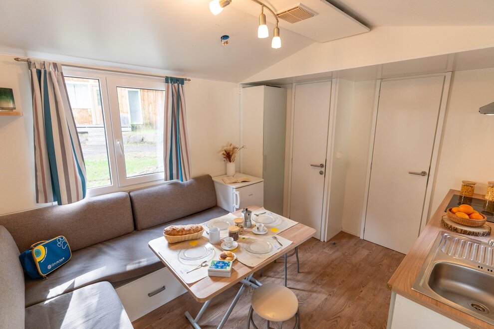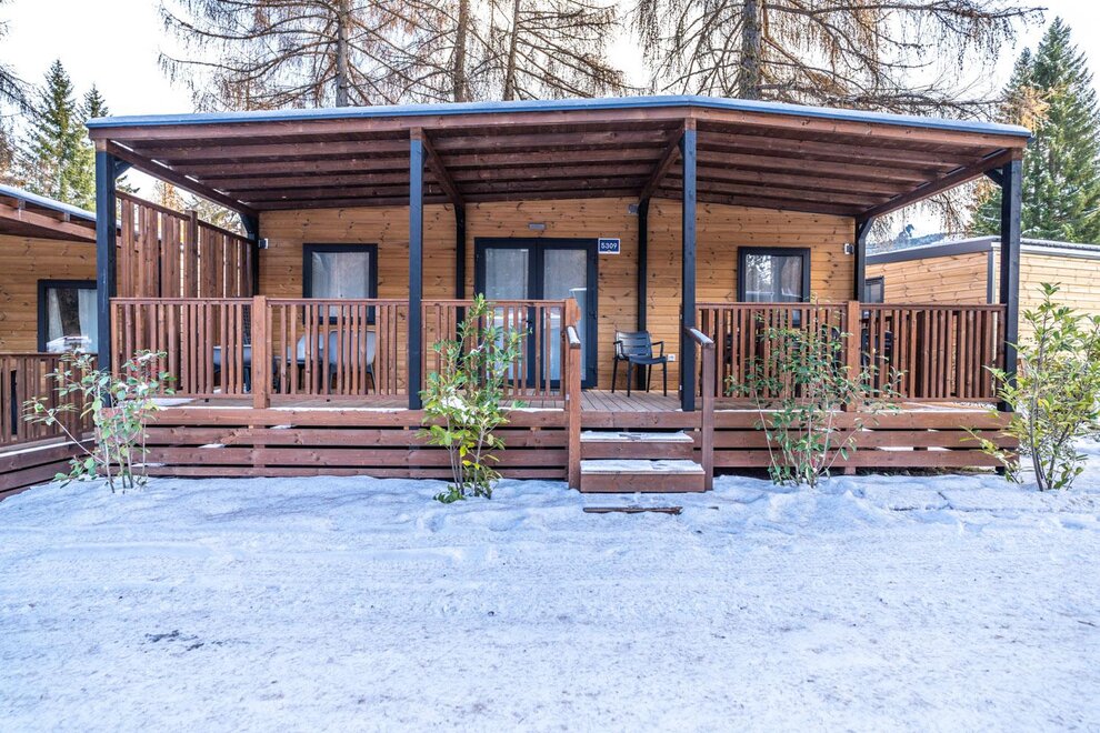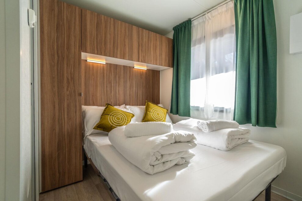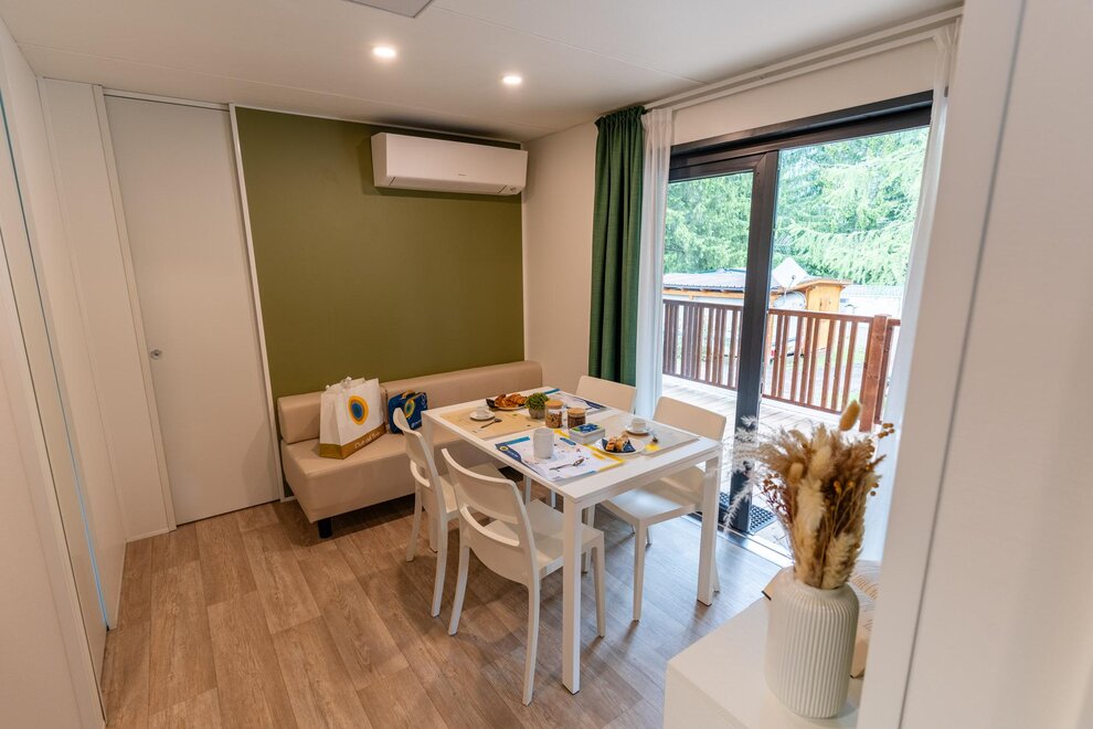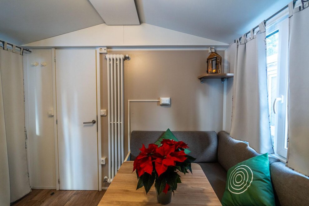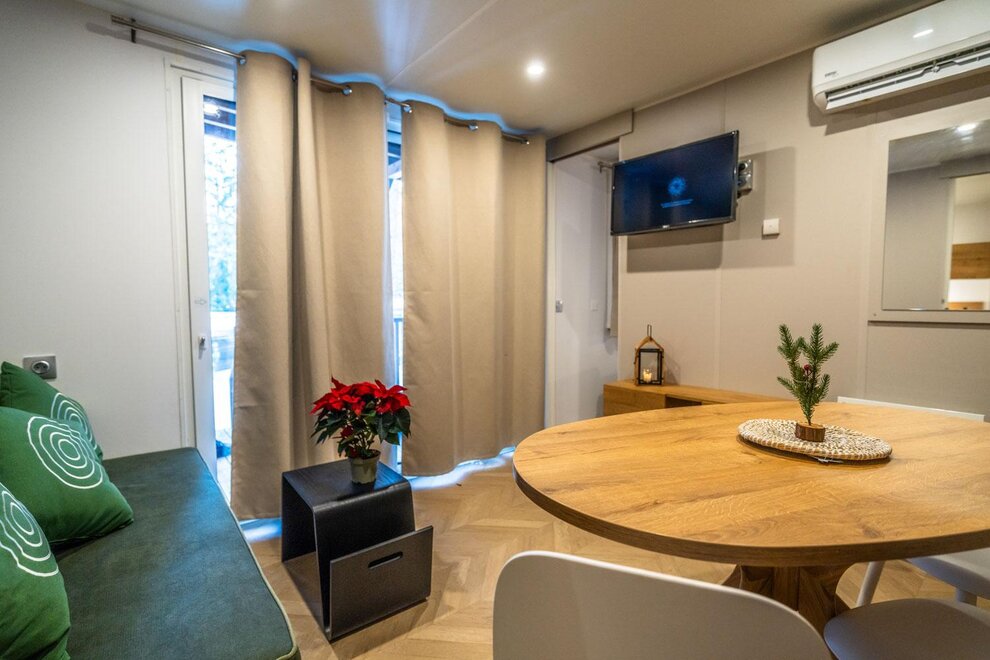 Допускаются животные. Мобильный дом площадью 24 кв.м с полукрытой верандой. Имеется одна спальня с двуспальной кроватью, одна спальня с 2 односпальными кроватями. Кухонный уголок с оснащенной кухней, холодильником, столом, стульями Иванию, телевизором, кондиционером, туалетом и ванной с душем. Максимальная вместимость - 4 человека. Парковочное место в деревне.
