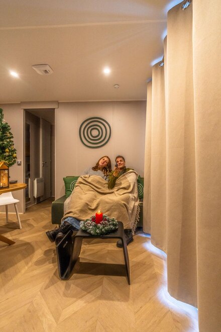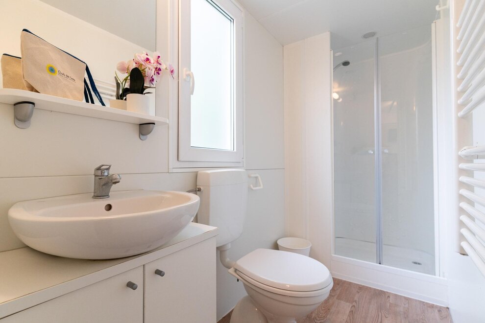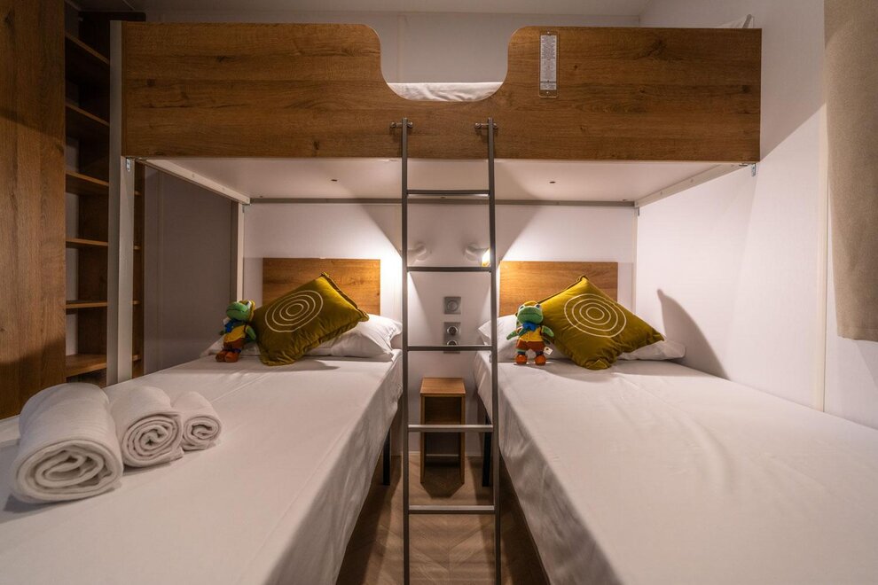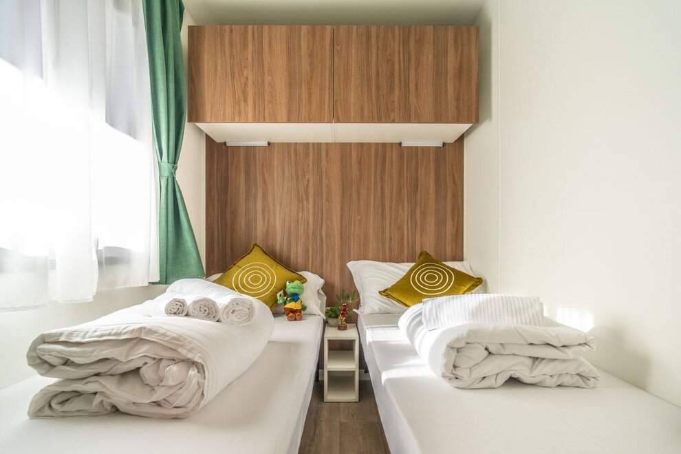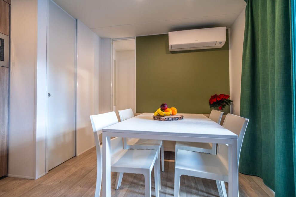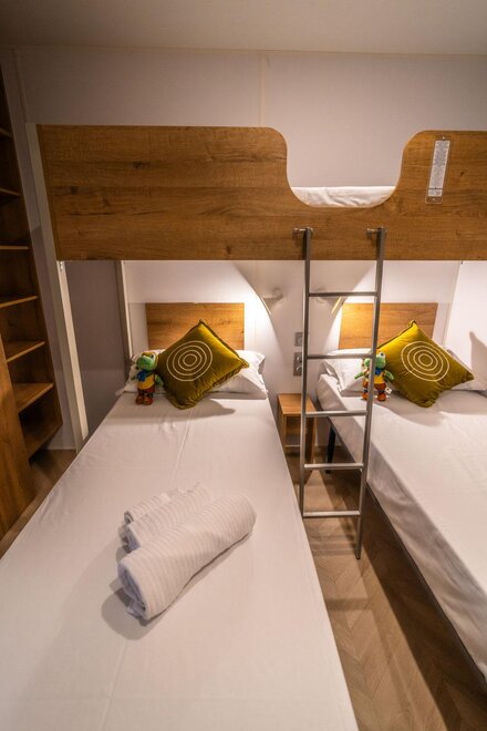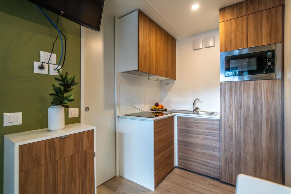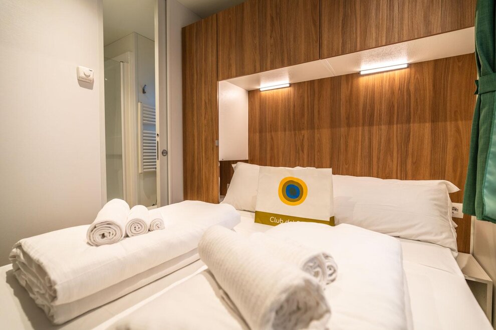Допускаются животные. Мобильный дом площадью 24 кв.м с полукрытой верандой. Имеется одна спальня с двуспальной кроватью, одна спальня с 2 односпальными кроватями. Кухонный уголок с оснащенной кухней, холодильником, столом, стульями Иванию, телевизором, кондиционером, туалетом и ванной с душем. Максимальная вместимость - 4 человека. Парковочное место в деревне.