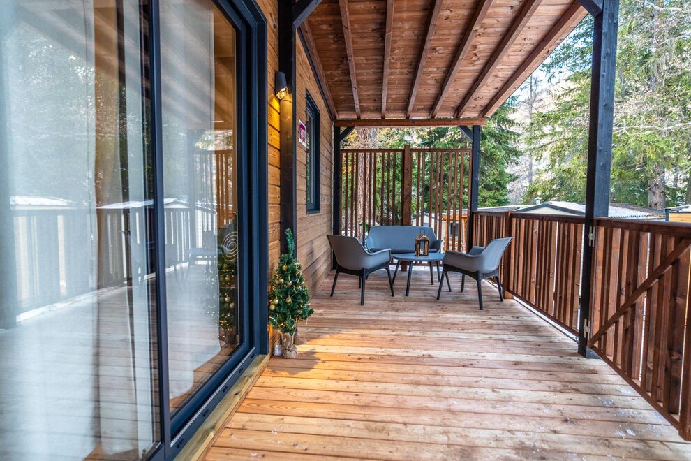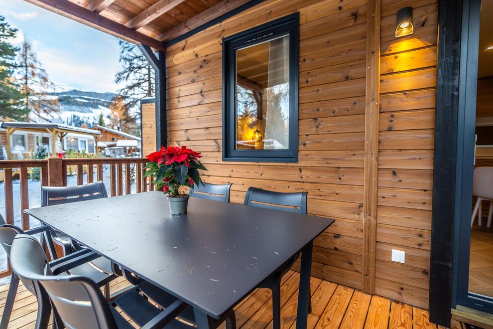 Разрешено проживание с животными. Площадь 34 м². Просторная крытая деревянная веранда с столом и стульями. 1 спальня с двуспальной кроватью, 1 спальня с двумя односпальными кроватями. Просторная гостиная с диваном, столом и стульями. Кухонный уголок, оборудованный посудомоечной машиной, плитой, холодильником, микроволновой печью, телевизором, кондиционером/отоплением, 2 ванные комнаты: 1 с душем, умывальником, биде, туалетом, 1 с душем, умывальником, туалетом. Крытая деревянная веранда с столом и стульями. Парковочное место в деревне.