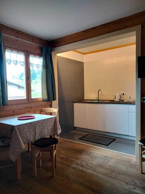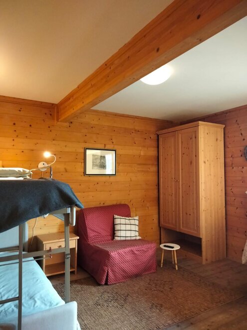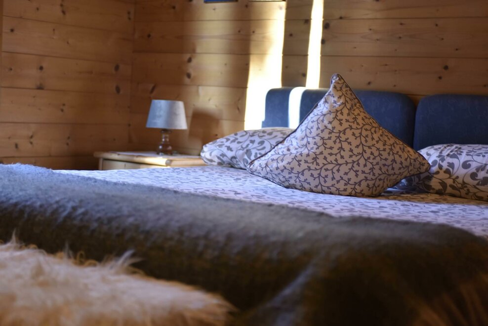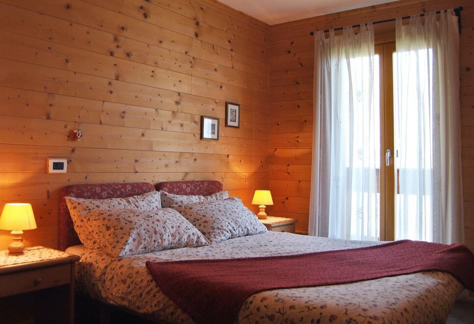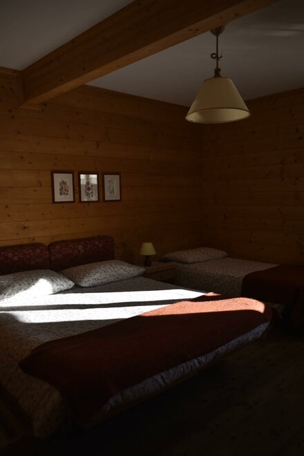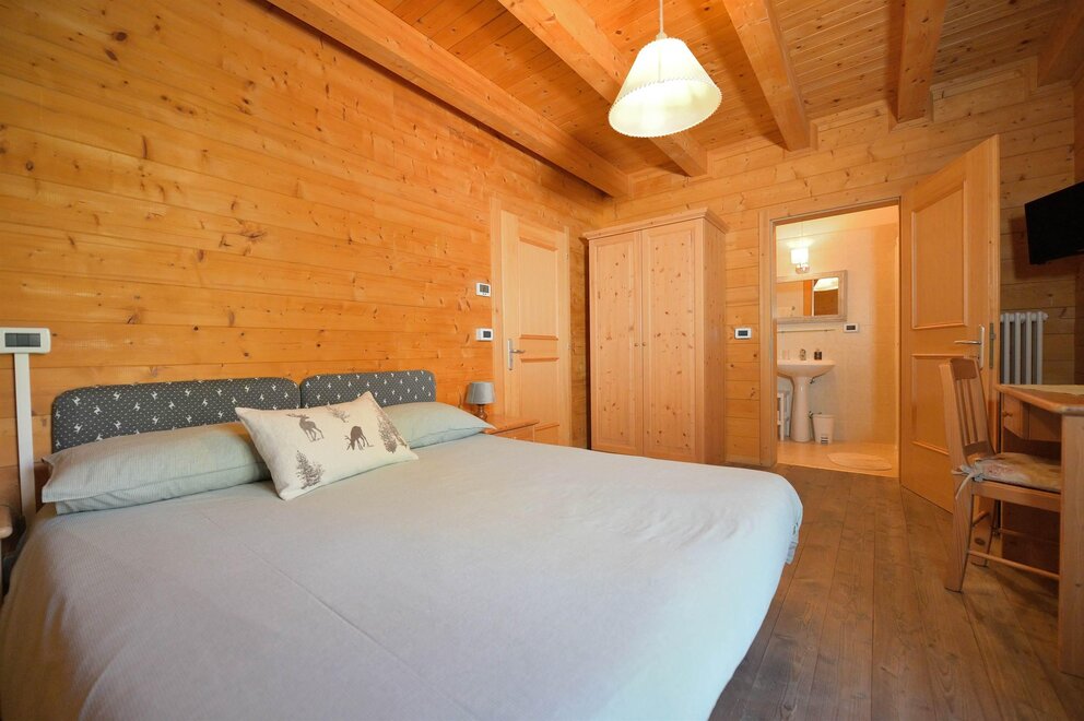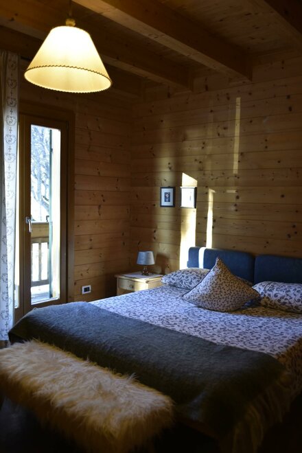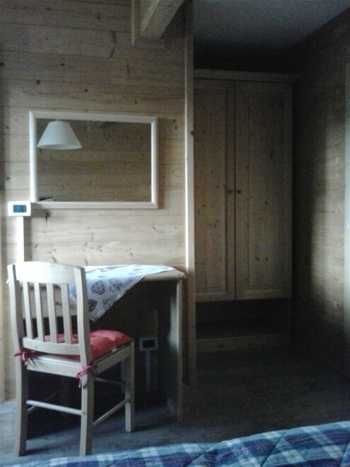 The room is decorated with wood, has a double and a single bed, autonomous heating, wardrobe, a small table with chair and a private bath with washbasin, shower and WC. There is an ample garden with garage. The breakfast is made with the products of Malga Mortigola. It’s possible to add a crib for children up to 3 years old.