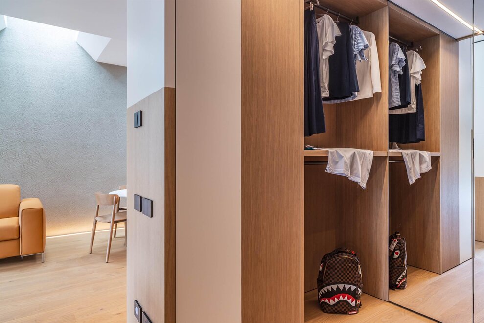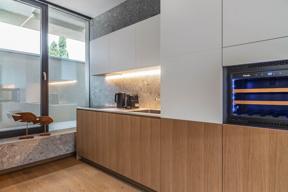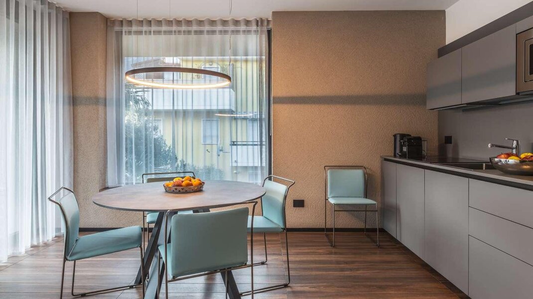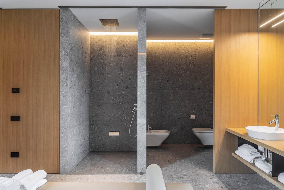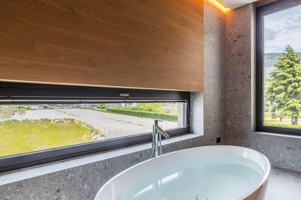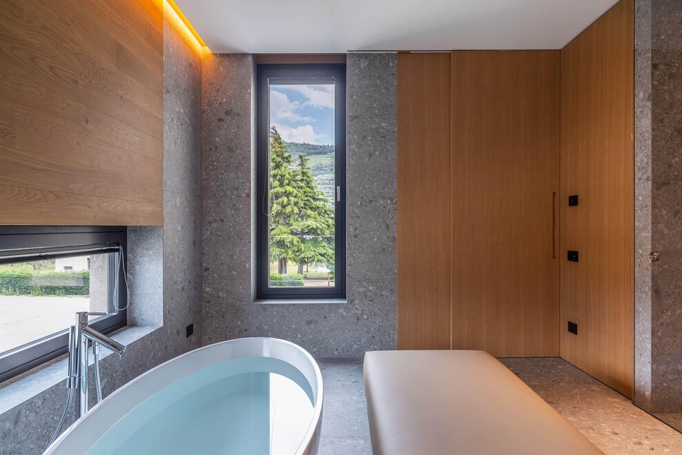 В интерьере оливковый ясень,typичный для озера Гарда, идеально гармонирует с насыщенными оттенками керамогранита, использованного в ванной. Завершает картину современная бытовая техника, автономное кондиционирование в каждой комнате и идеальная звукоизоляция.