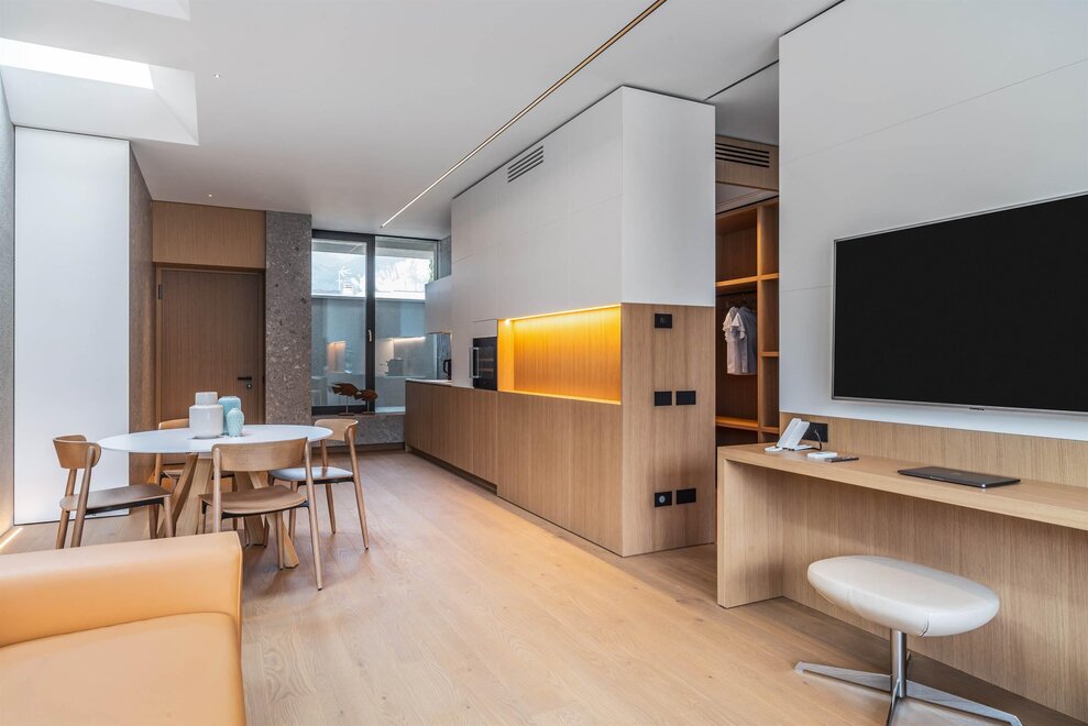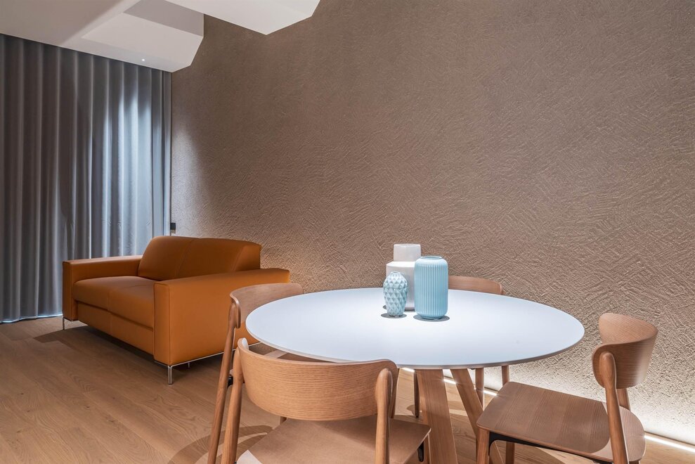 Интерьеры La Rocchetta Studio обладают выдающимися элементами дизайна, такими как освещение, созданное Давиде Гроппи, с революционными системами "Infinito" и "Nulla". Завершают картину теплый паркет в спальне, выполненный из швейцарского биодерева.